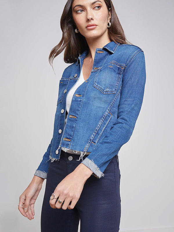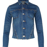 A vibrant blue denim jacket with a feminine fit and an ultra-soft feel. Luxurious stretch denim hugs the body while allowing complete freedom of movement. Timeless design features a classic collar, double chest pockets, and a front button closure. Slimming tapered seams and a raw, ravaged hem add a modern edge.