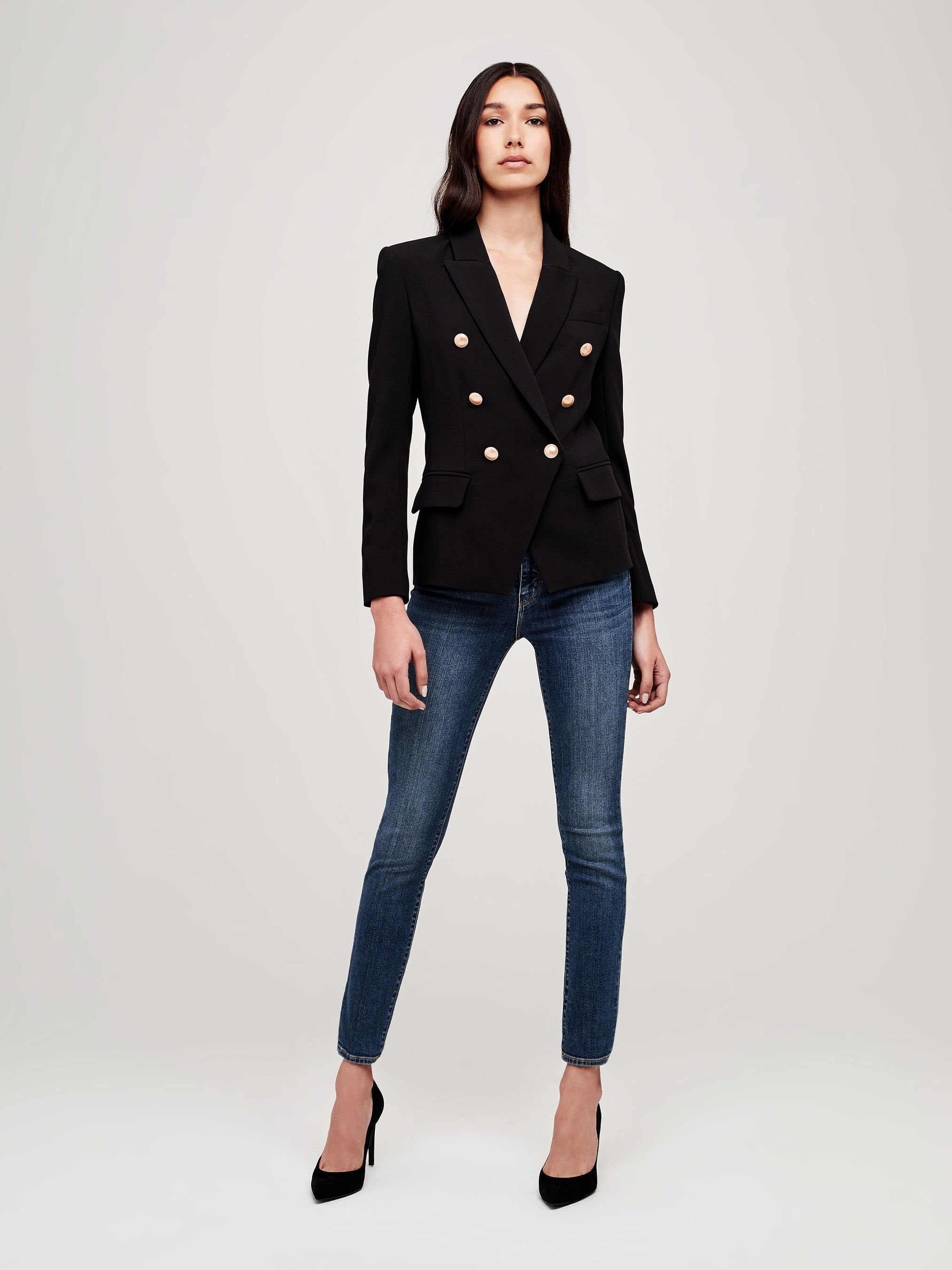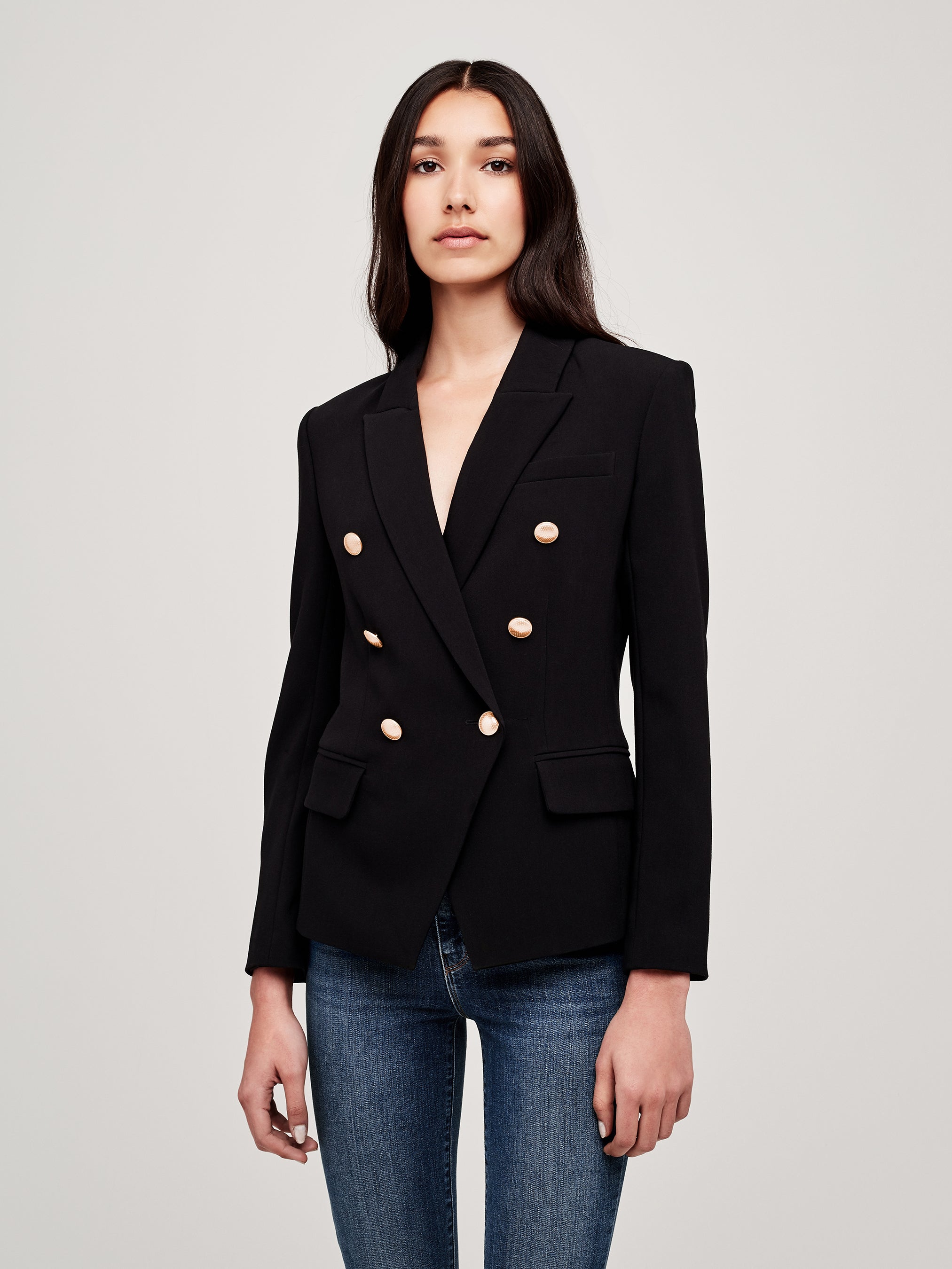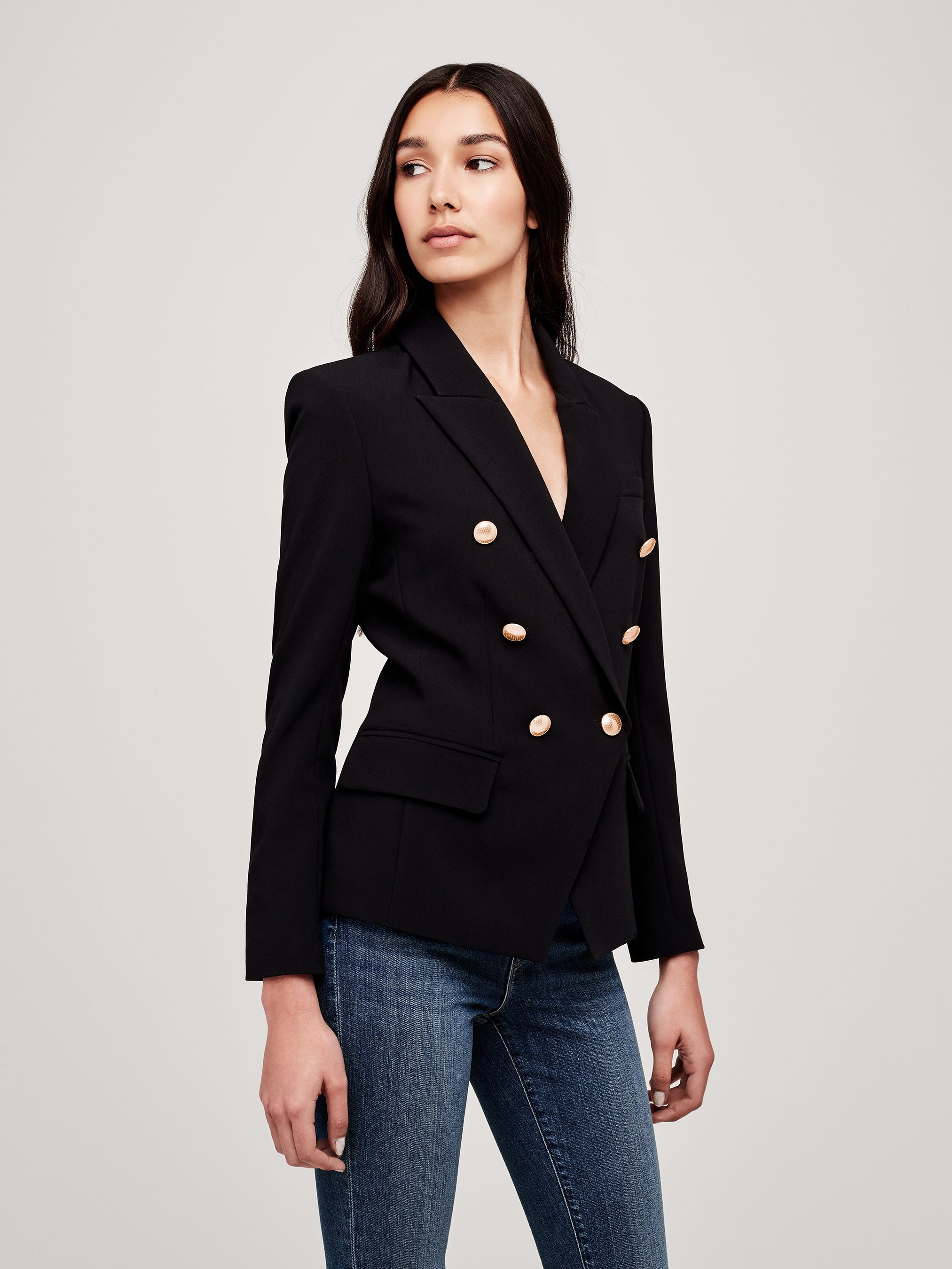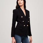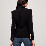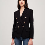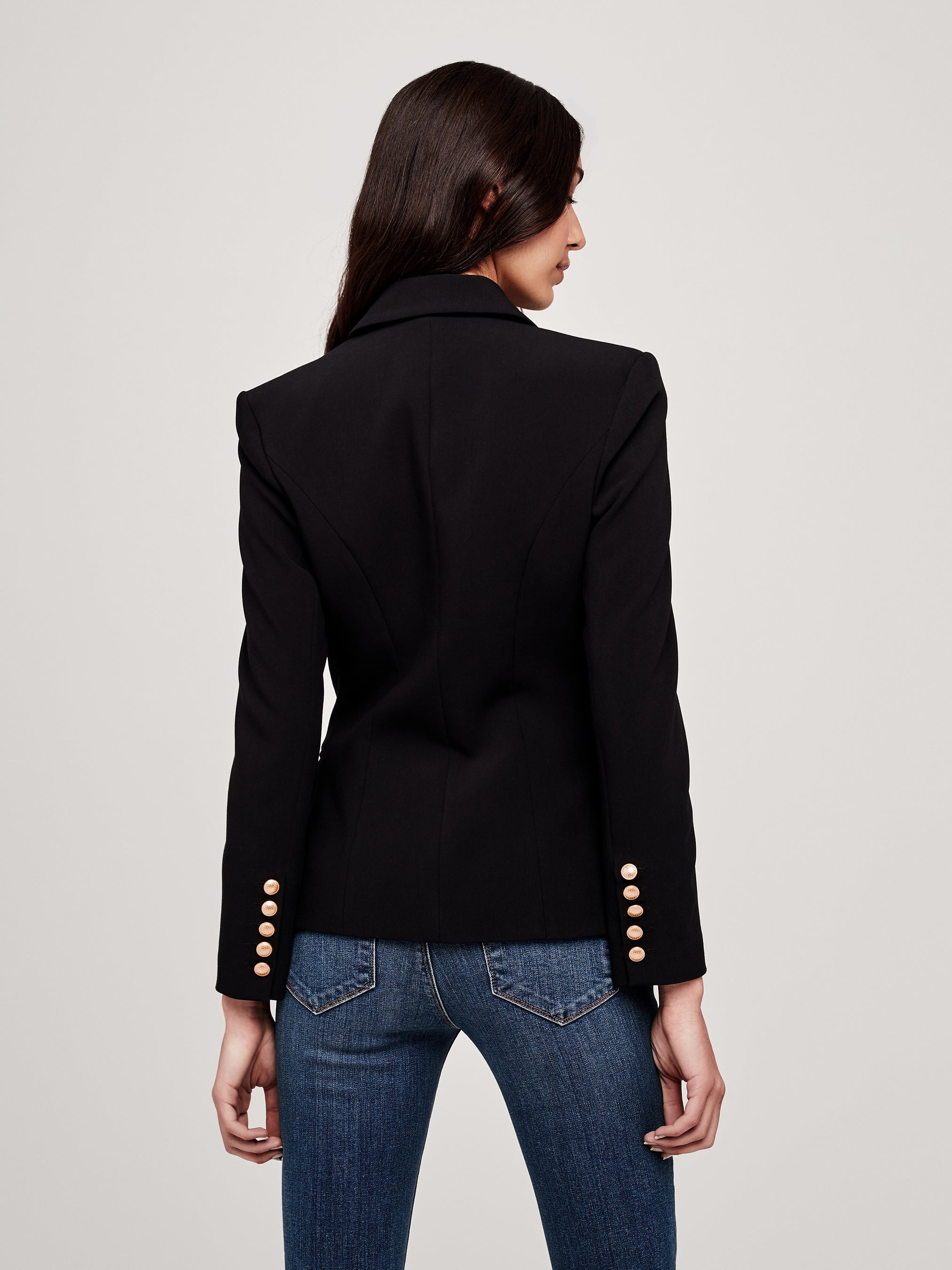 An expertly crafted double-breasted blazer in black. Smart, tailored construction features strong shoulders, peaked lapels, seamed flap pockets, and a fitted, tapered waist. Detailed with six domed buttons in gold. Double button closure, fully lined.