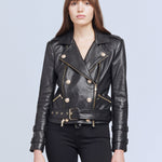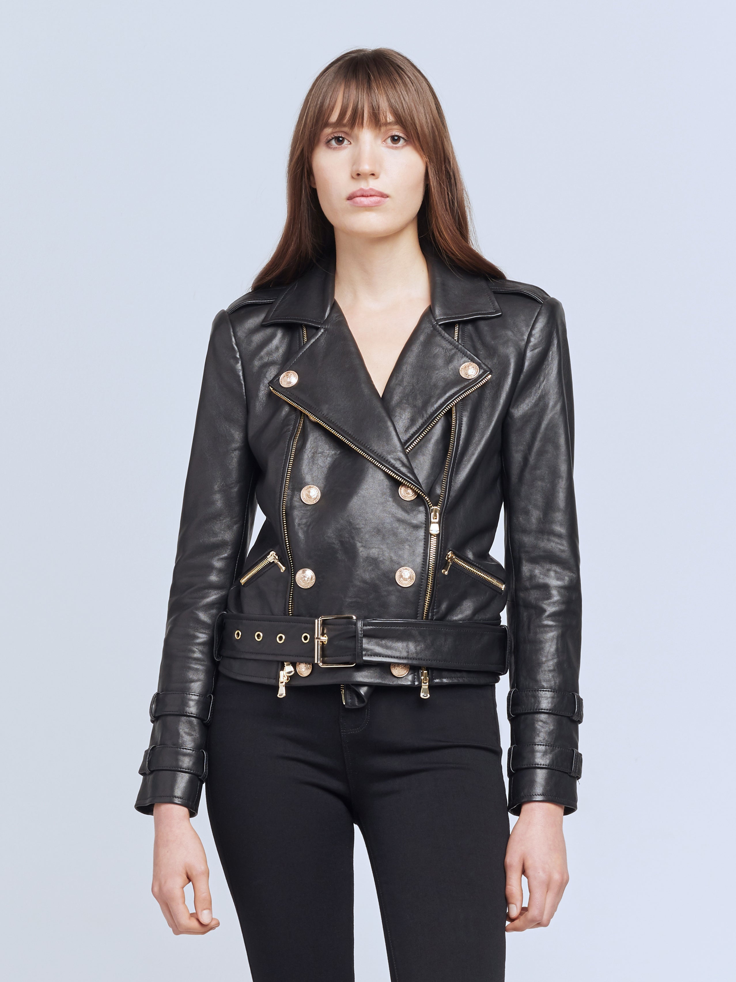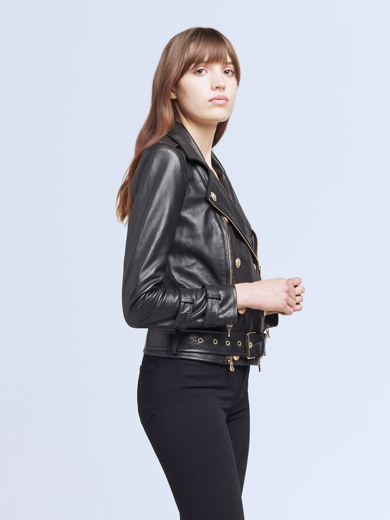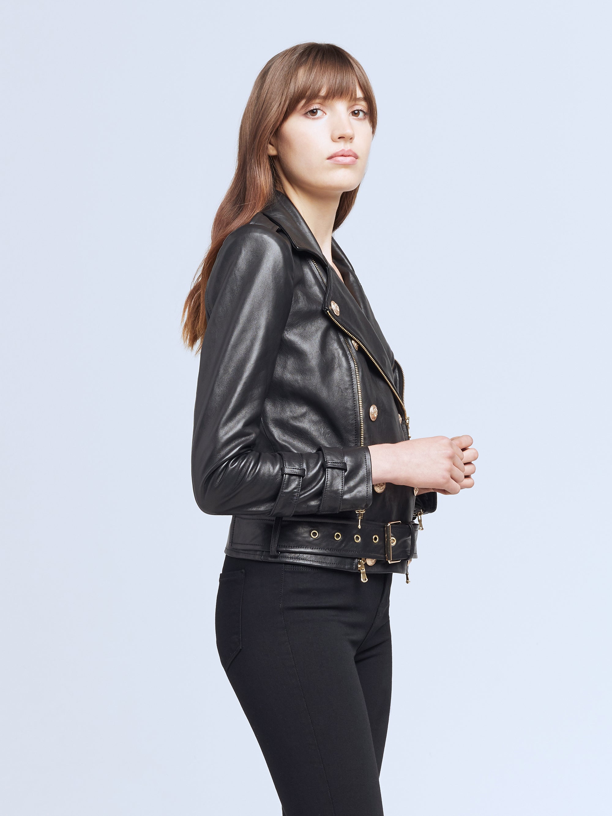 Biker style meets feminine elegance. Chic, blazer-inspired details like embossed gold buttons and peaked lapels elevate this black leather jacket, crafted from 100% luxury lambskin. Classic biker elements like zippers, straps, and a chunky belt maintain an edgy authenticity.