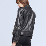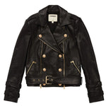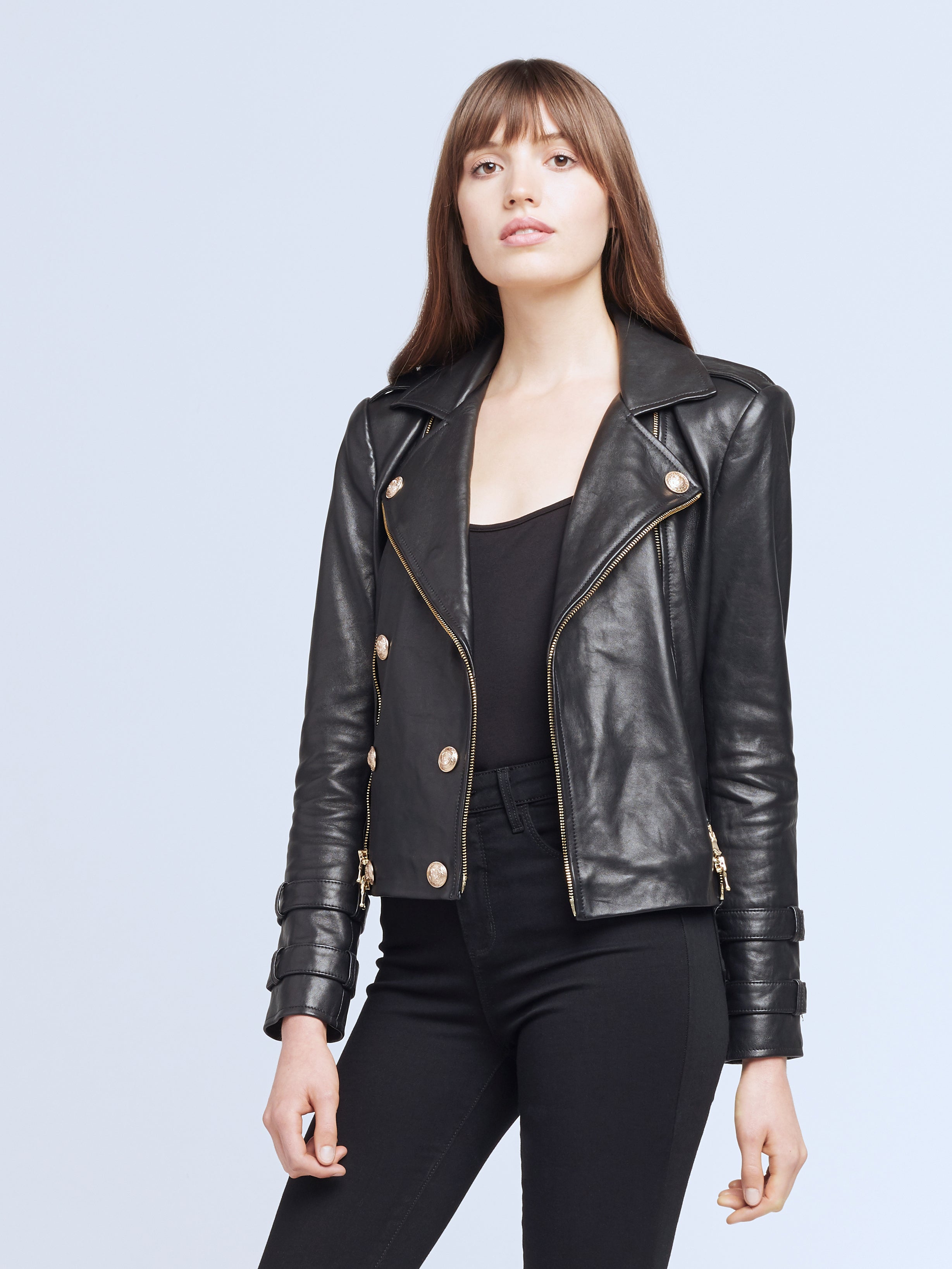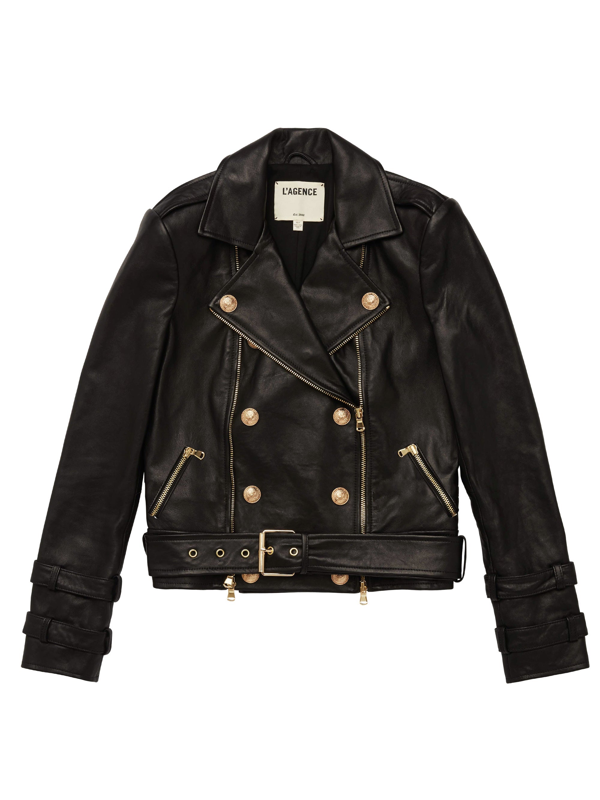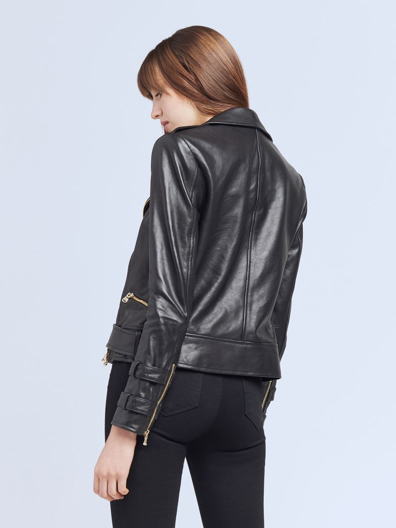 Biker style meets feminine elegance. Chic, blazer-inspired details like embossed gold buttons and peaked lapels elevate this black leather jacket, crafted from 100% luxury lambskin. Classic biker elements like zippers, straps, and a chunky belt maintain an edgy authenticity.