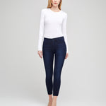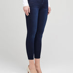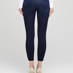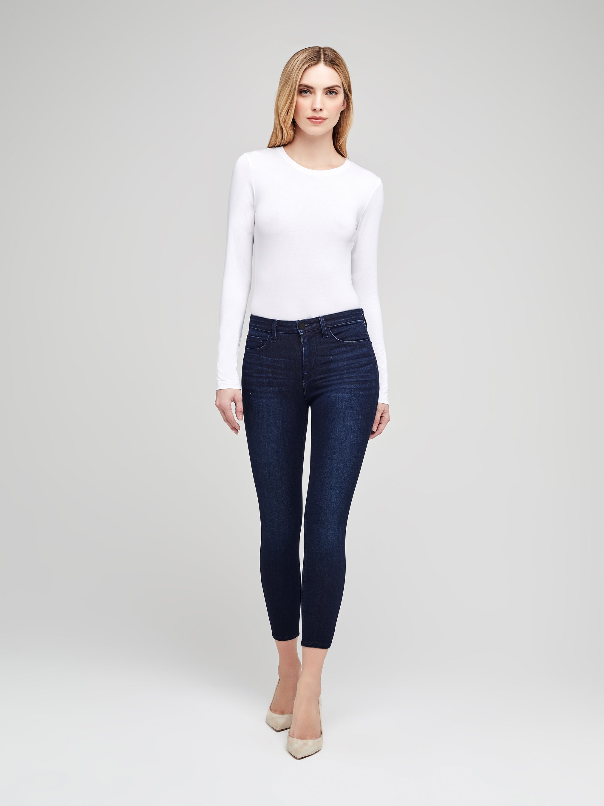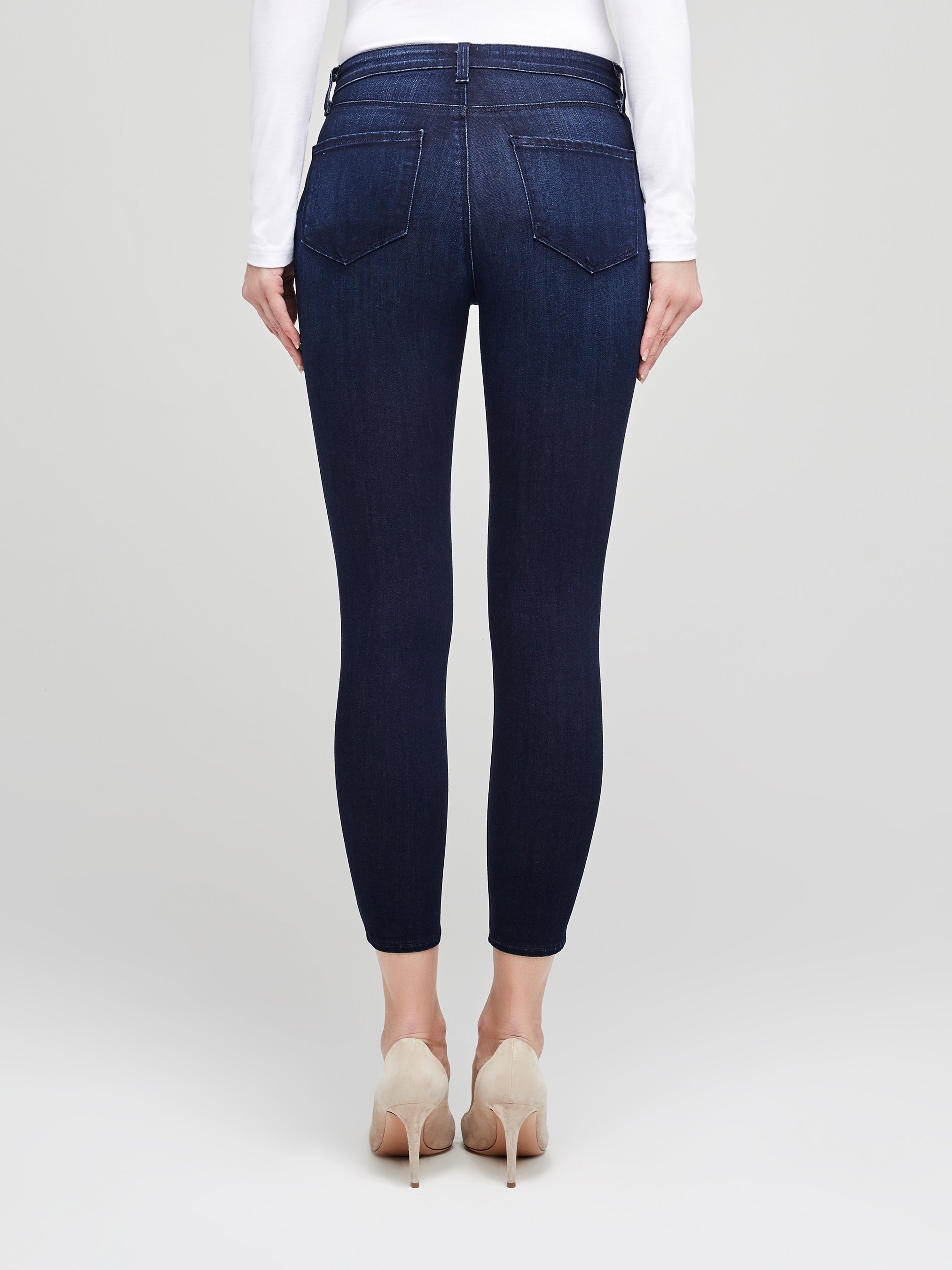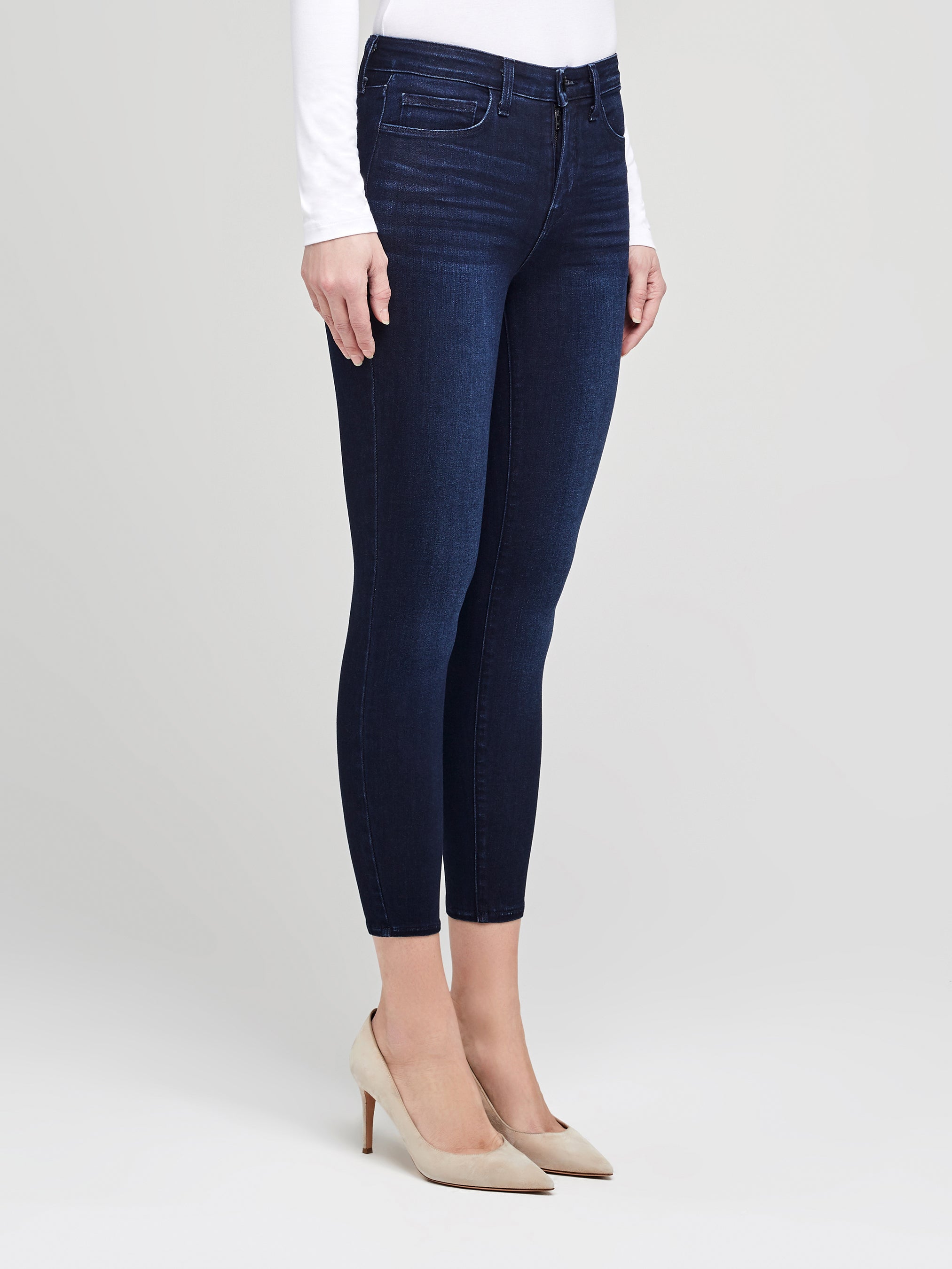 Our signature high-rise skinny jean crafted from premium, luxurious stretch denim. Tonal stitching and matte black button closure blend into the saturated navy denim for a seamless effect. Tapered leg hugs from hip to ankle, while the contoured waistband defines and slims the natural waist. High-recovery fabric holds its shape, smoothing the silhouette without sacrificing comfort.