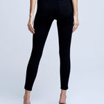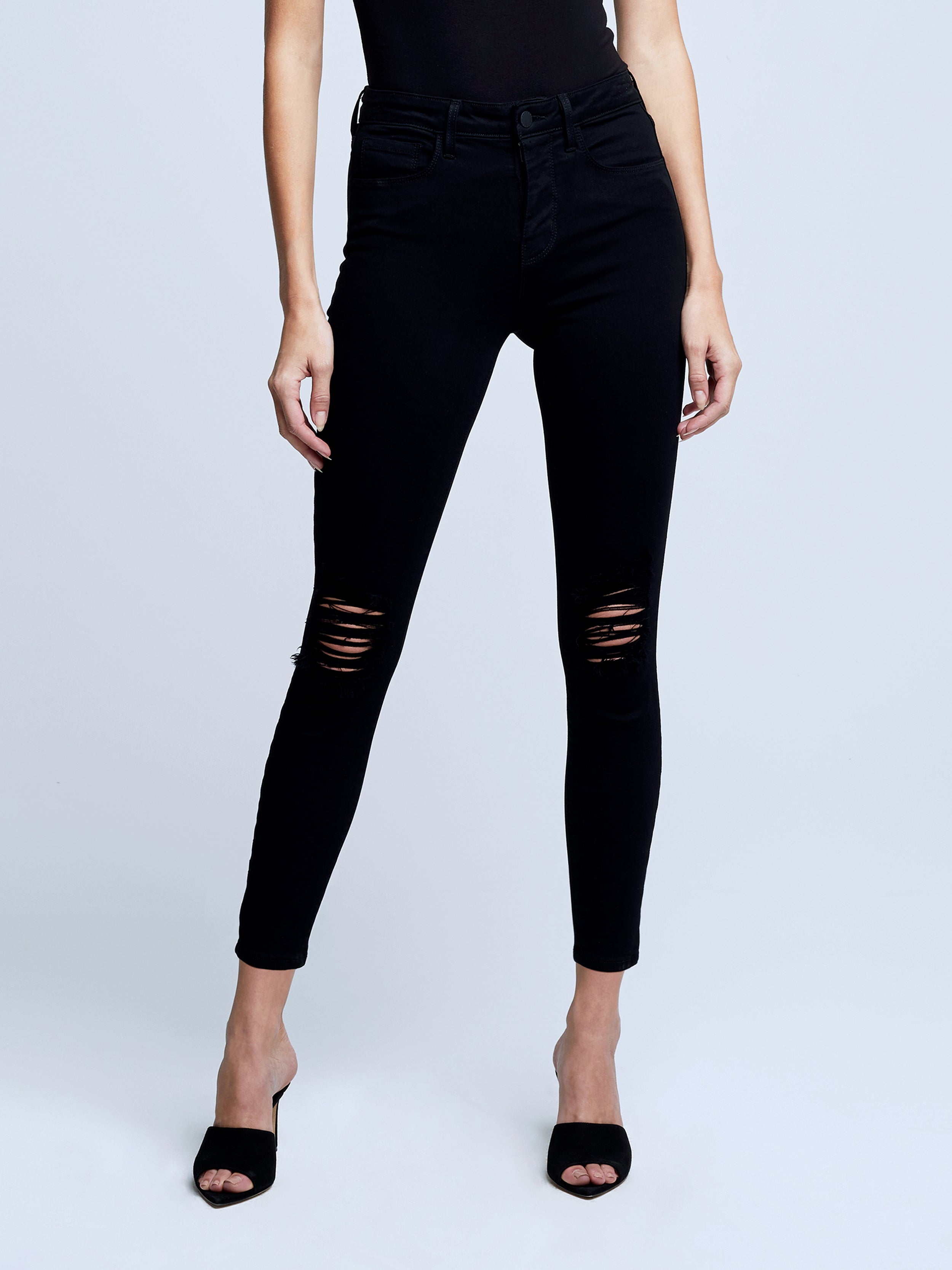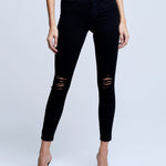 The Margot high-rise skinny jean in a saturated-black premium stretch denim design with destructed knees. Features a contoured waistband and tapered leg that hug from waist to ankle to define and slim the silhouette. The high-recovery denim holds its shape, smoothing the figure without sacrificing comfort. Style includes 5-pocket construction and a front zip closure with a tonal button.