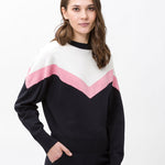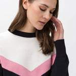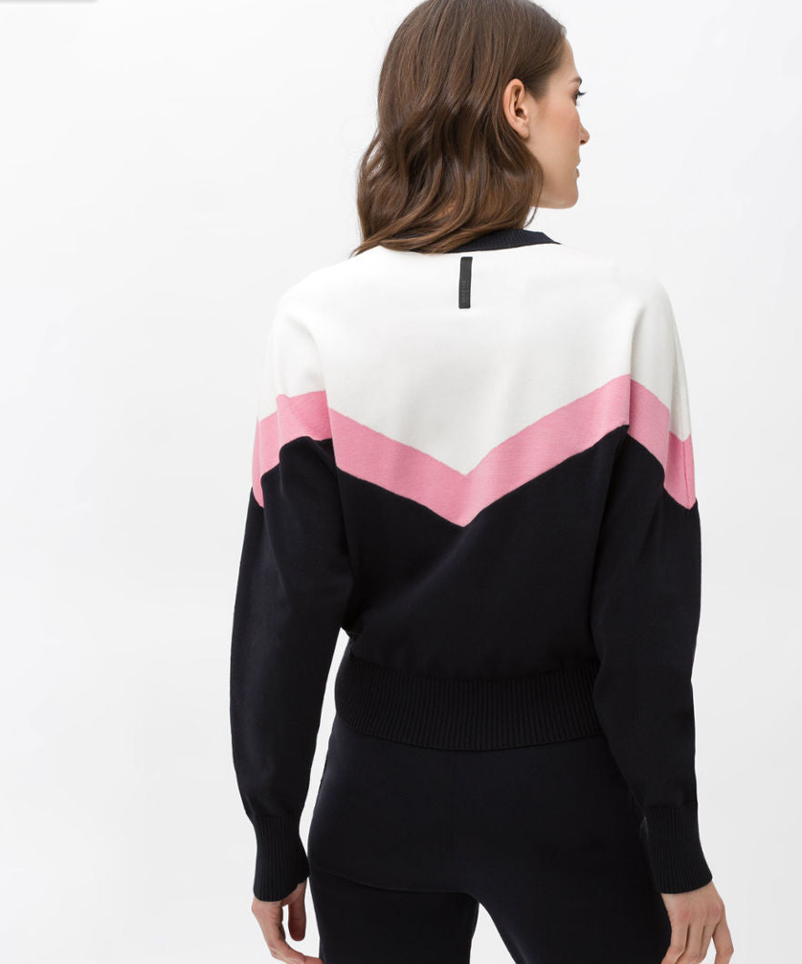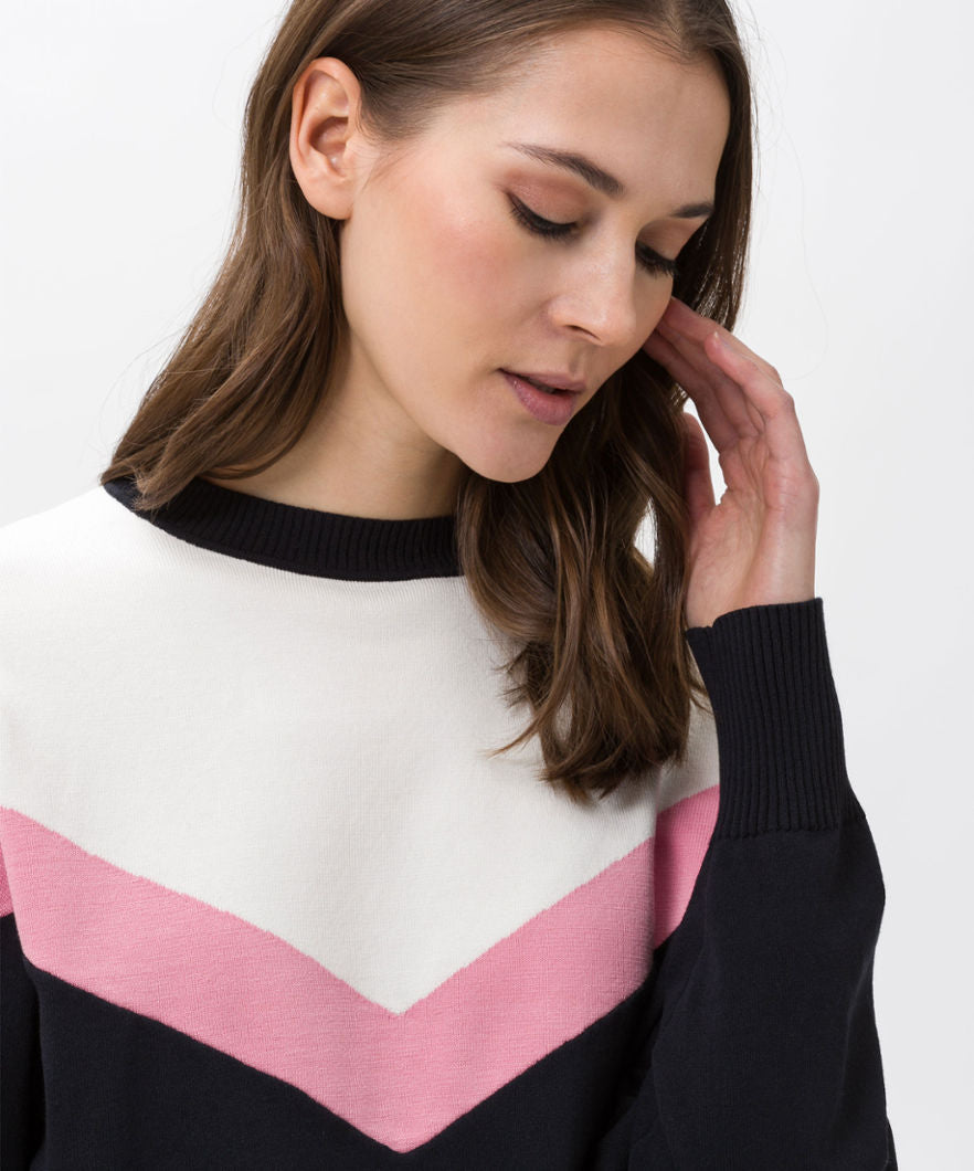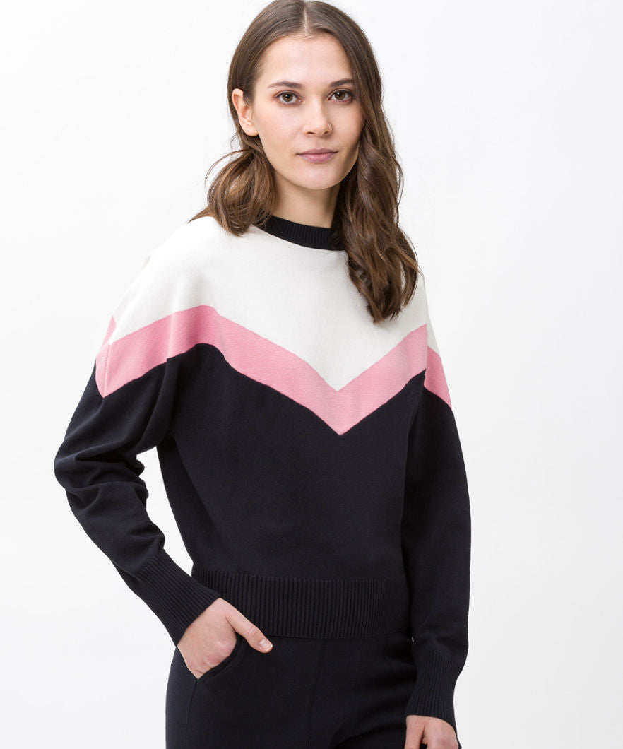 The Feline style from the BRAX LAB collection is a women's sweater for your fashion-conscious outfit. The high-quality cotton mix and the contemporary design of this knitted jumper are appealing. Easy and comfortable: The modern silhouette with a round neckline and dropped shoulders promises a casual look. Staged with intarsia stripes in color blocking and fashionable ribbed cuffs on the hem and sleeves. For women who value fashion and quality.