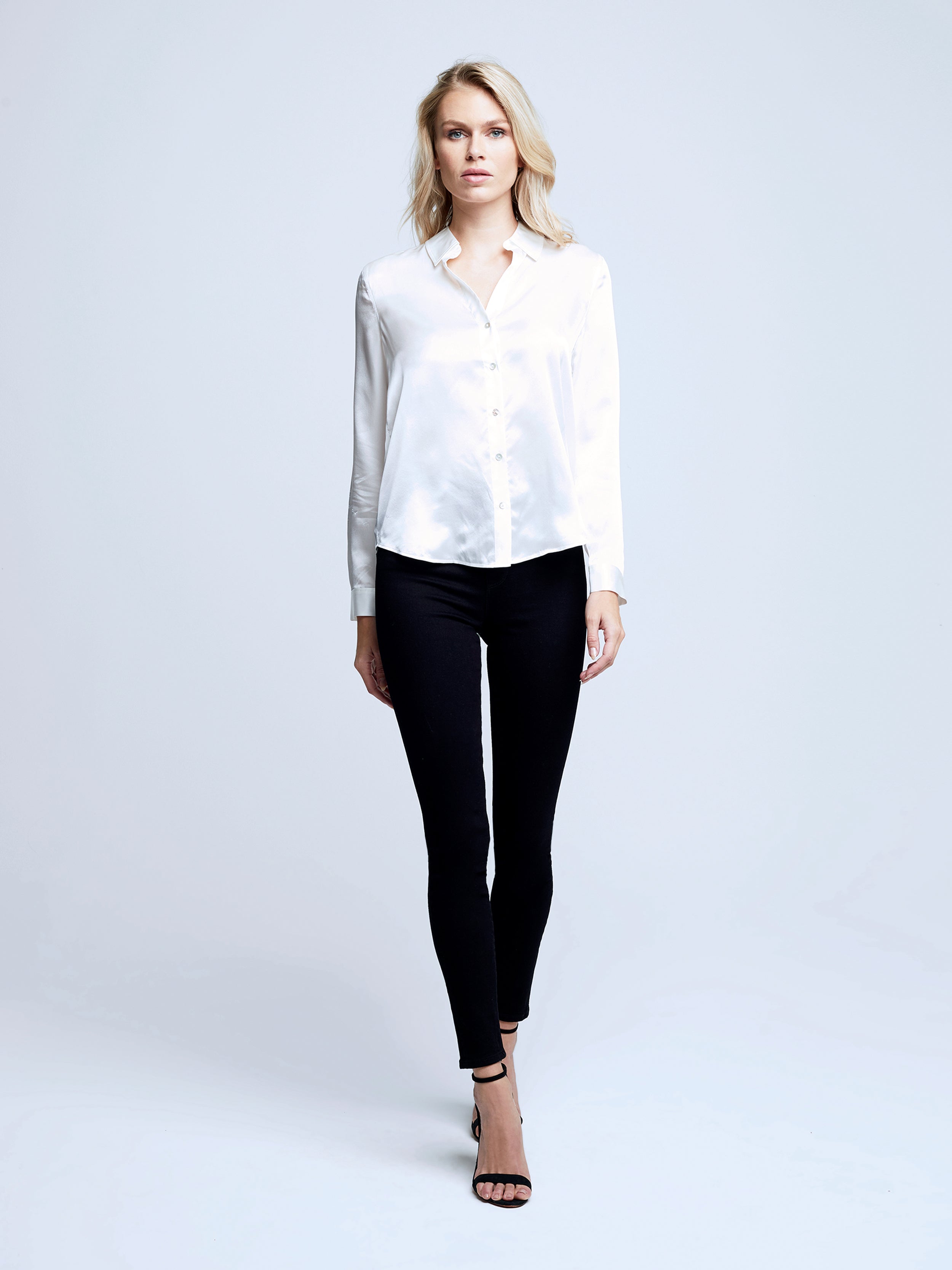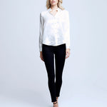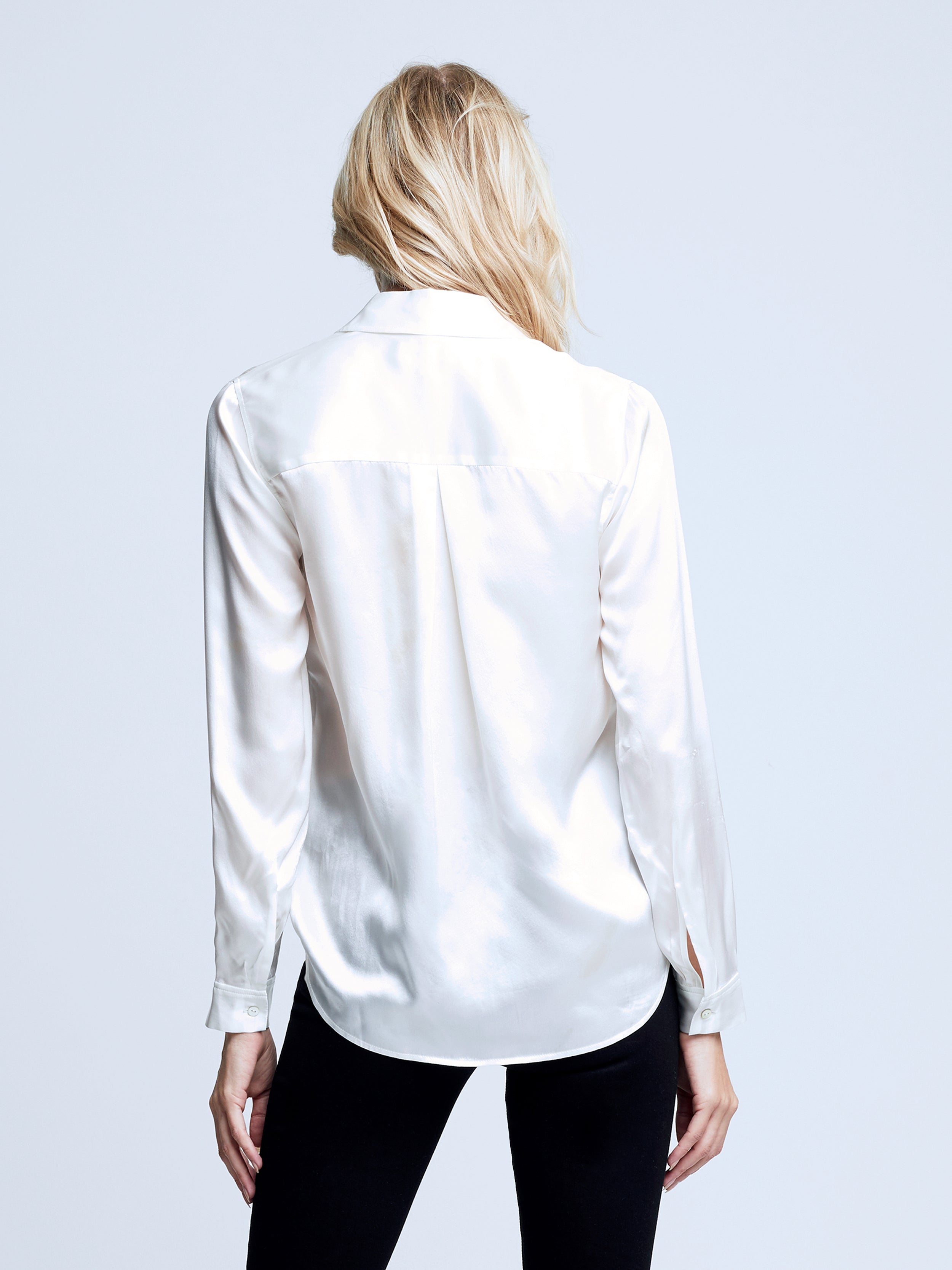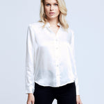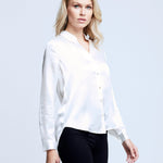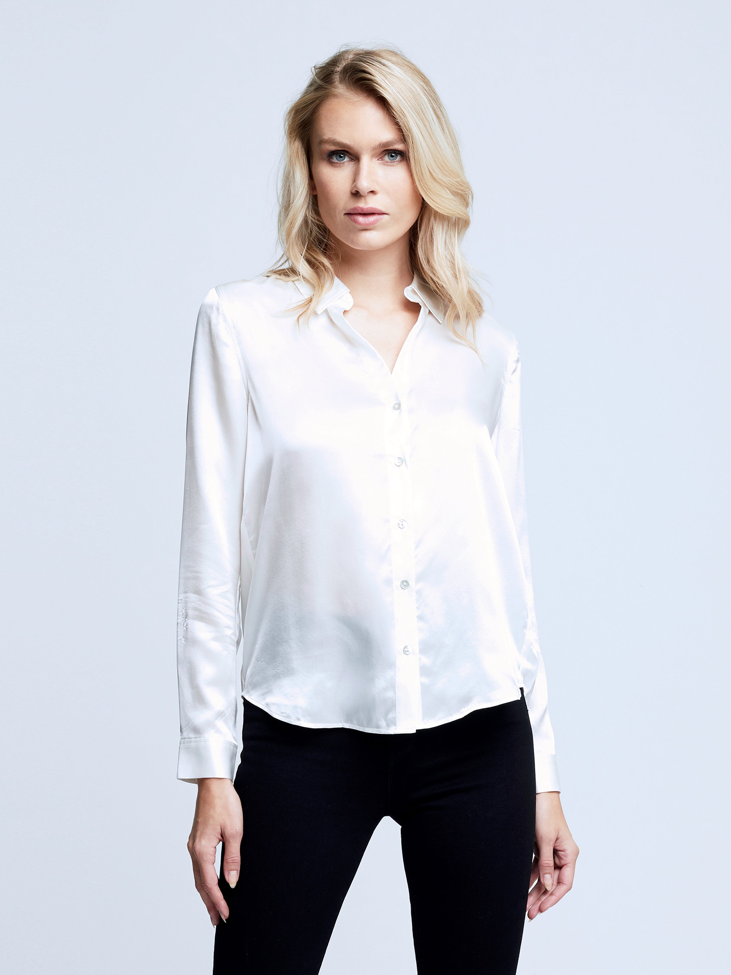 A quintessential blouse in a lustrous silk charmeuse and ivory hue. Classic look has a soft, liquid hand and tailored silhouette shaped by sharp sartorial details like a stand collar, long button-cuff sleeves and back yoke with inverted pleat. An open neckline and curved hem add a subtle femininity. A nimble style that works equally well with jeans or skirts. Fastens in front with pearl-hued buttons. 100% Silk.