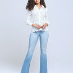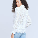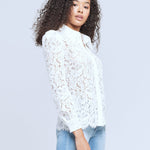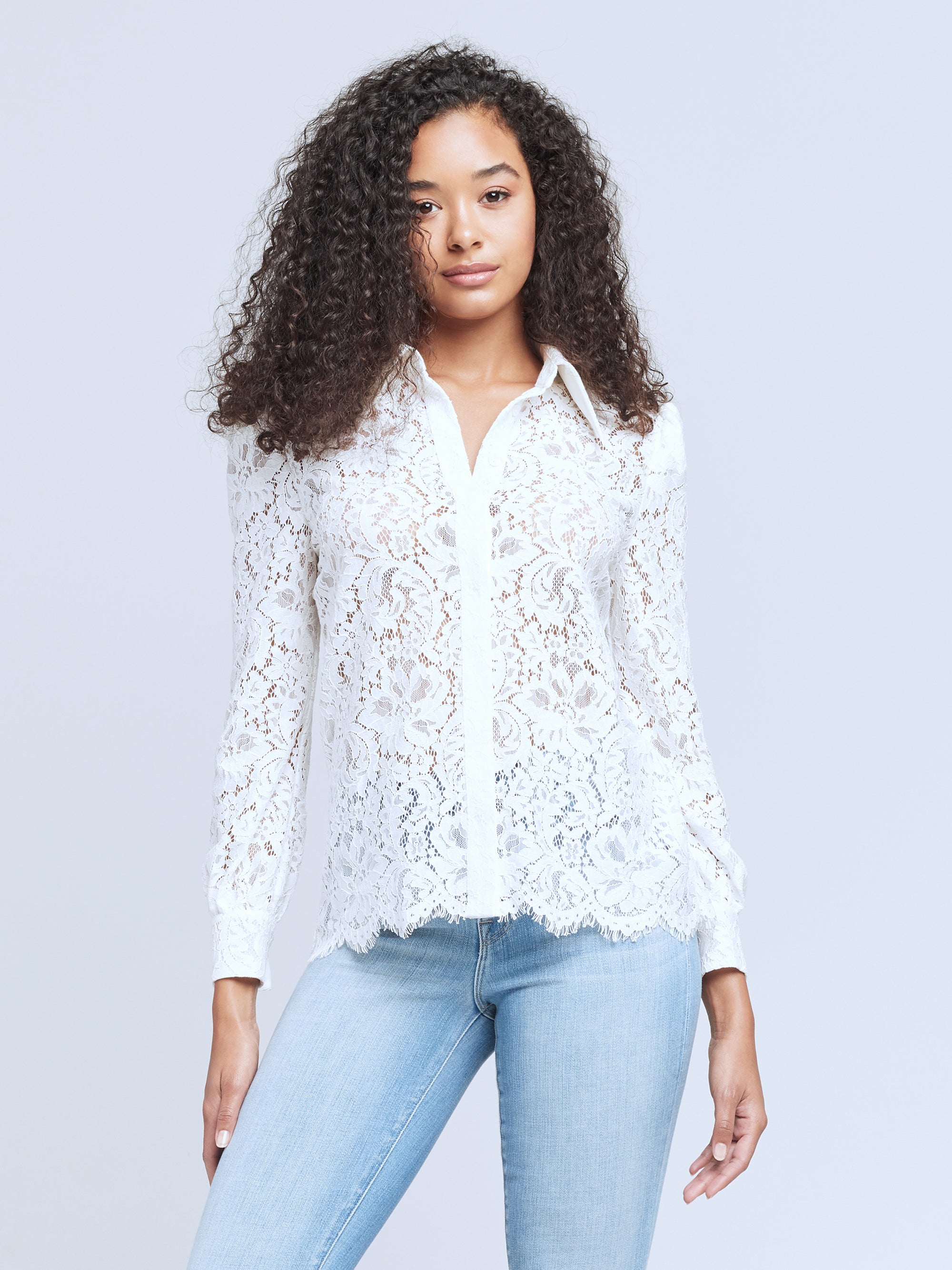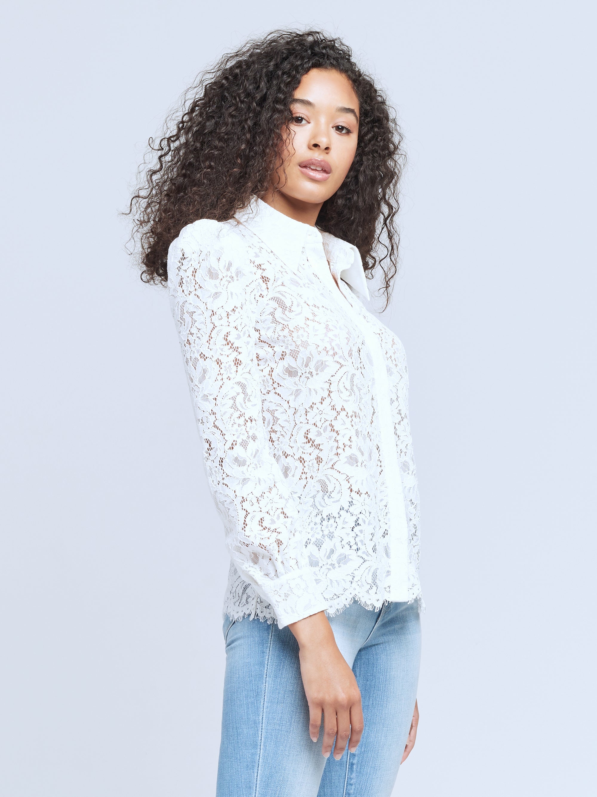 An elevated button-down blouse in an exquisite lace and ivory hue. The relaxed design includes sartorial details like a spread collar, shirttail hem, and long button-cuff sleeves. Soft puffed shoulders offer a beautifully feminine finish. Front button closure.