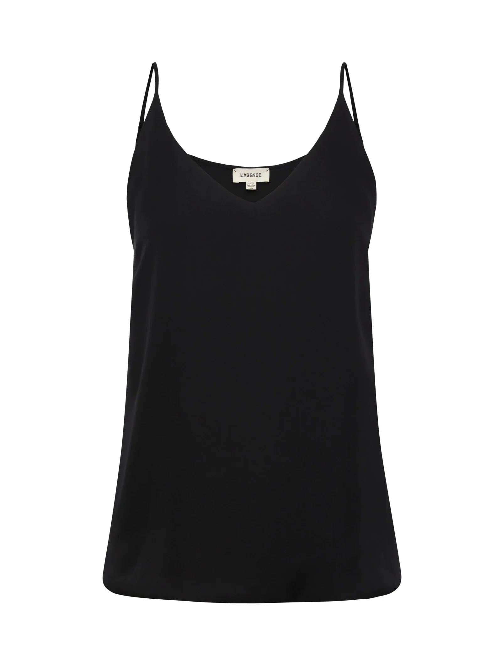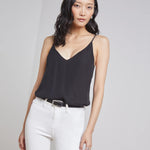 A slinky, 100% silk v-neck tank in ivory. Sharp v-neckline, adjustable spaghetti straps, and darted cups streamline the silhouette, and make for the perfect layering piece.