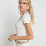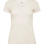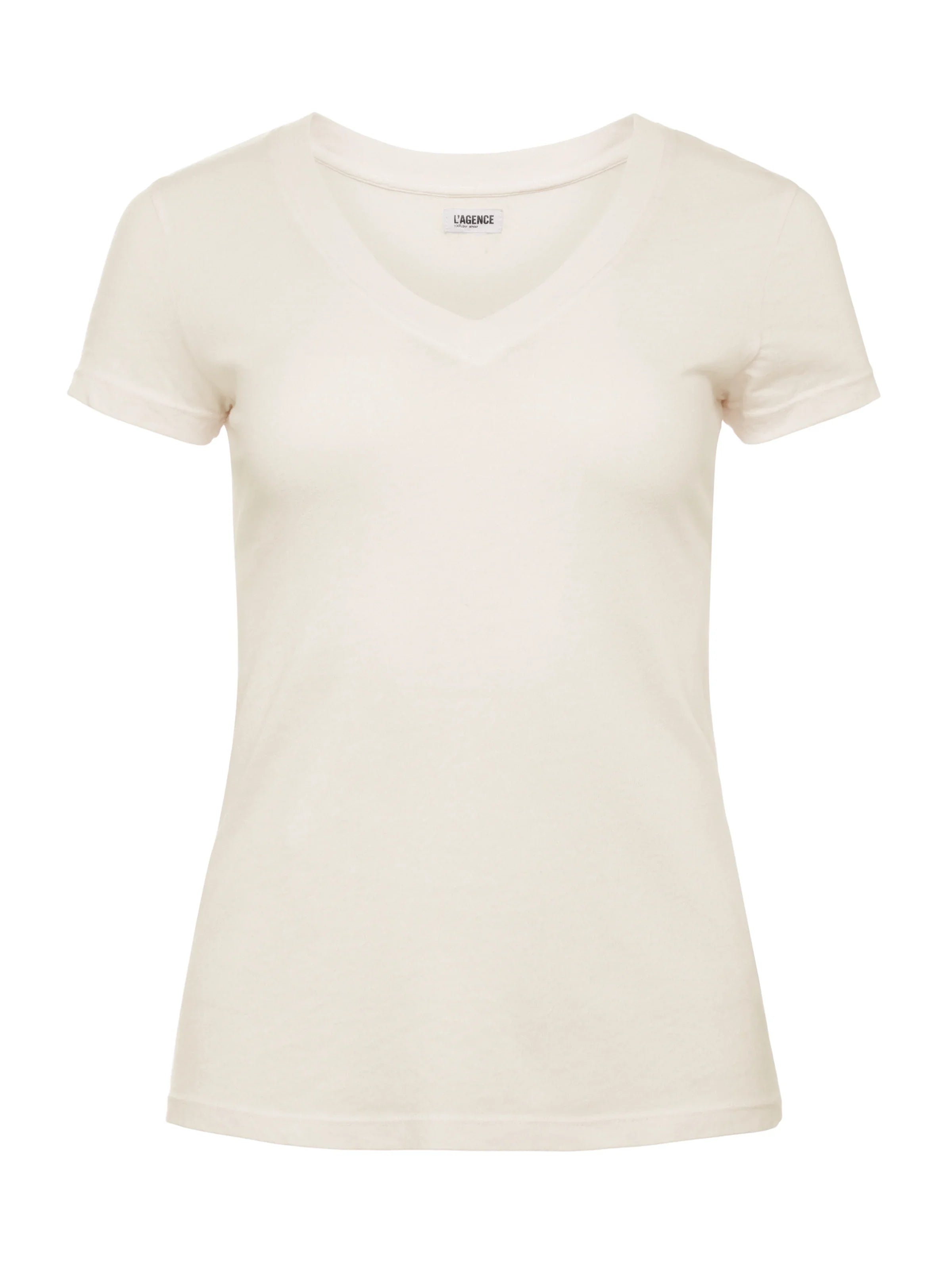 A taupe colored, classic cut tee with a sharp V-neckline and short sleeves is crafted from a super soft cotton with a light hand. The slim fit and flattering neckline make this closet-staple an ideal base layer.