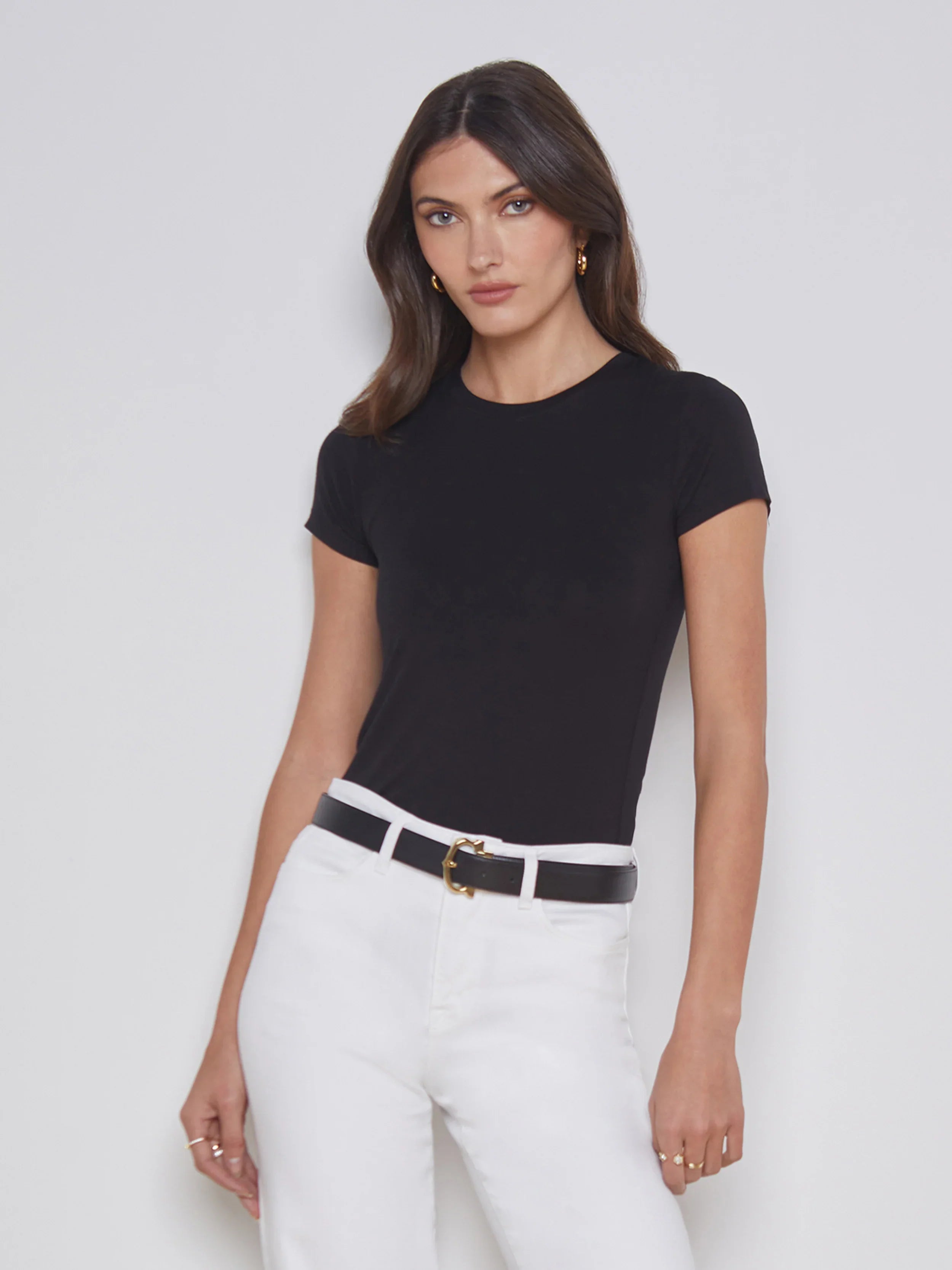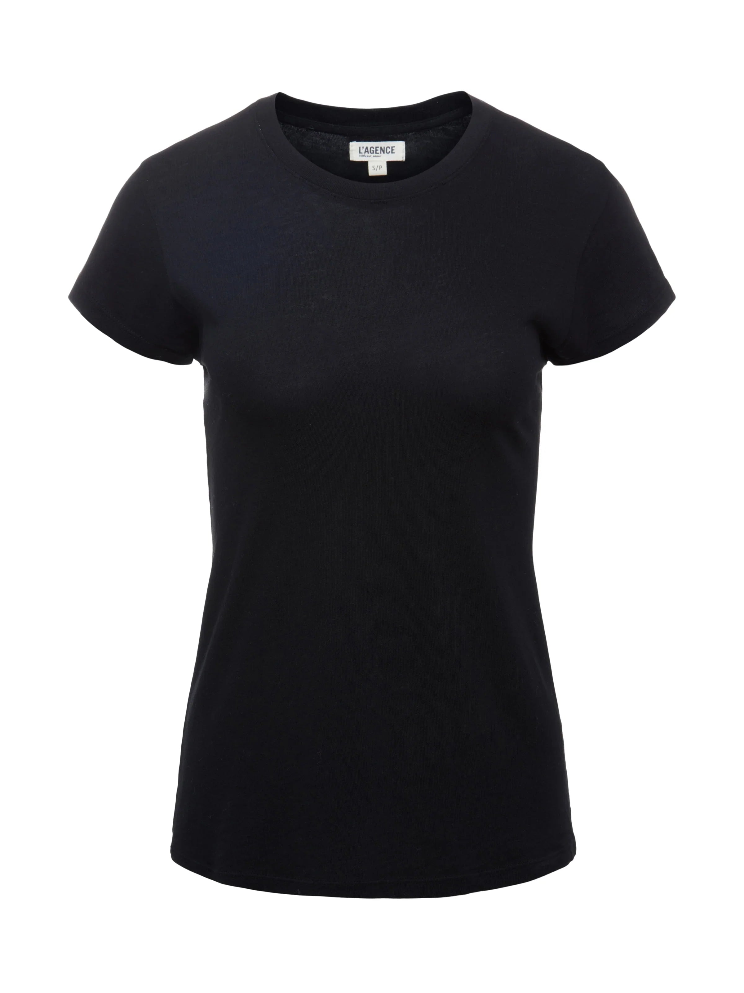 A form-fitting crew neck tee in rich black. Crafted from soft and stretchy luxe microfiber, Ressi features a high crew neck, clean-cut short sleeves, and a smooth, lean fit.