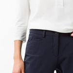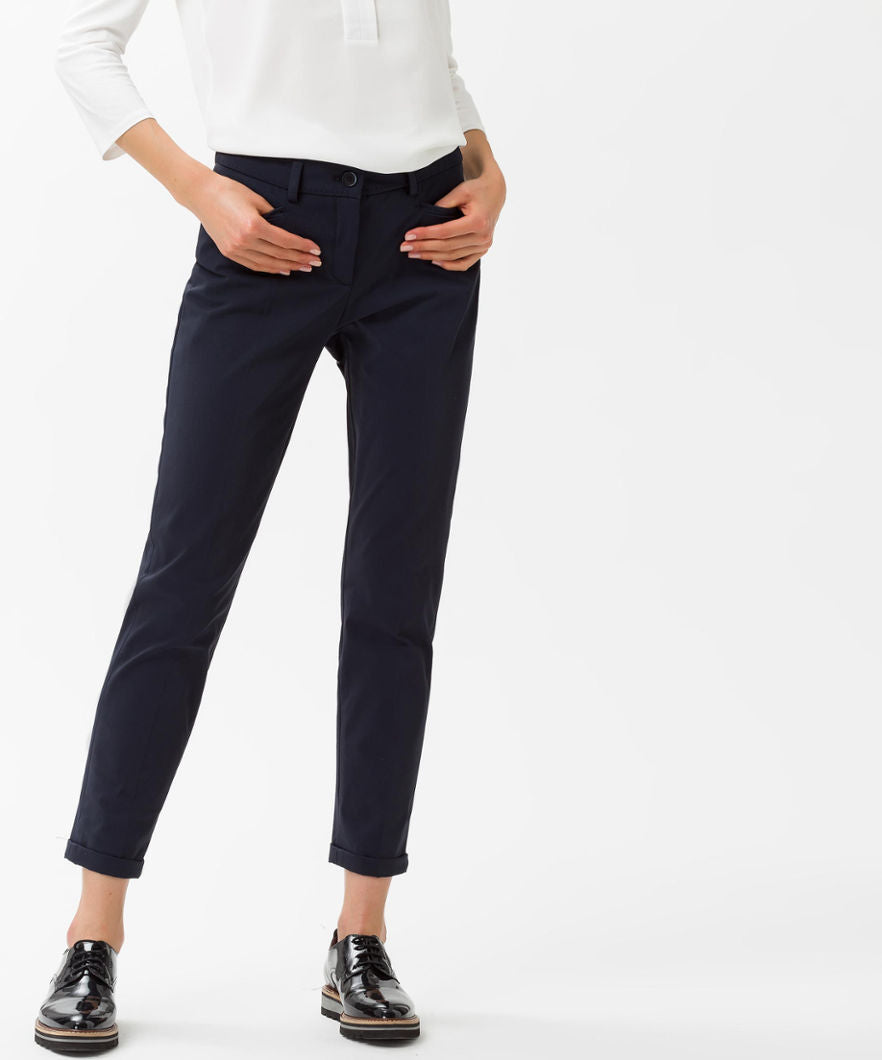 The slim-cut, slightly cropped trousers are the perfect accompaniment for business and leisure. The ready-made slimline style of the women's trousers looks good in the soft cotton mix and the smart design. Typical style elements, such as the classic underwire break, and subtle equipment and processing details enrich the valuable chinos. The cotton-polyamide mix impresses with a certain heaviness, a cool feel and a smooth surface. The modern interpretation of chinos proves to be elegant and at the same time modern city trousers.