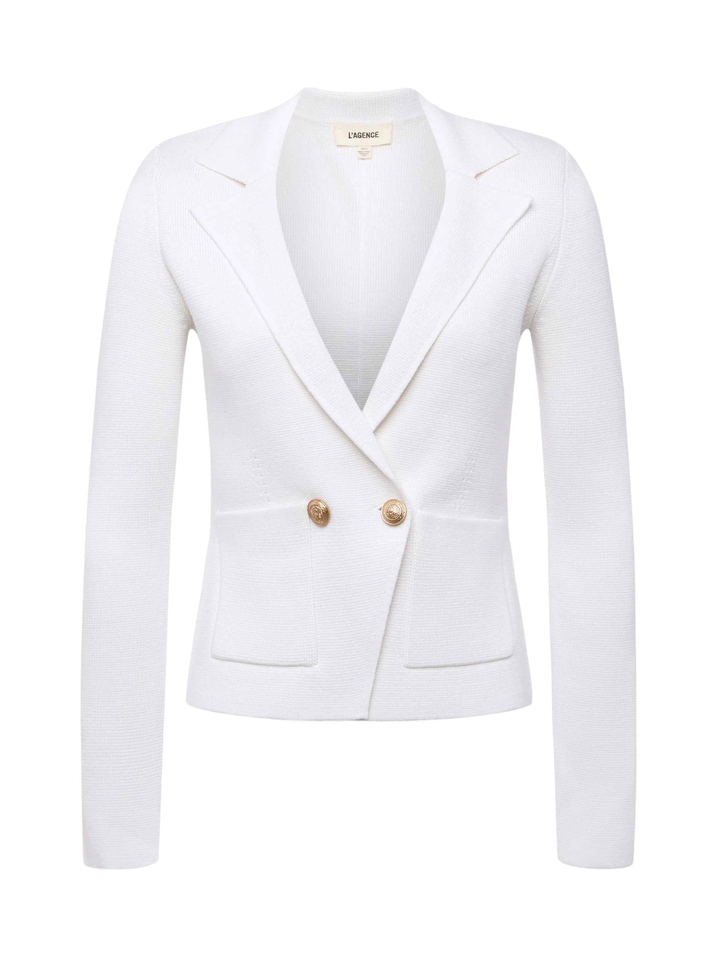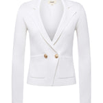 A premium knit double-breasted blazer in pure white. Tapering to the waist, feminine style is balanced by smart tailored touches like sleek lapels and patch pockets. Gleaming gold embossed-dome buttons add a luxe finish.