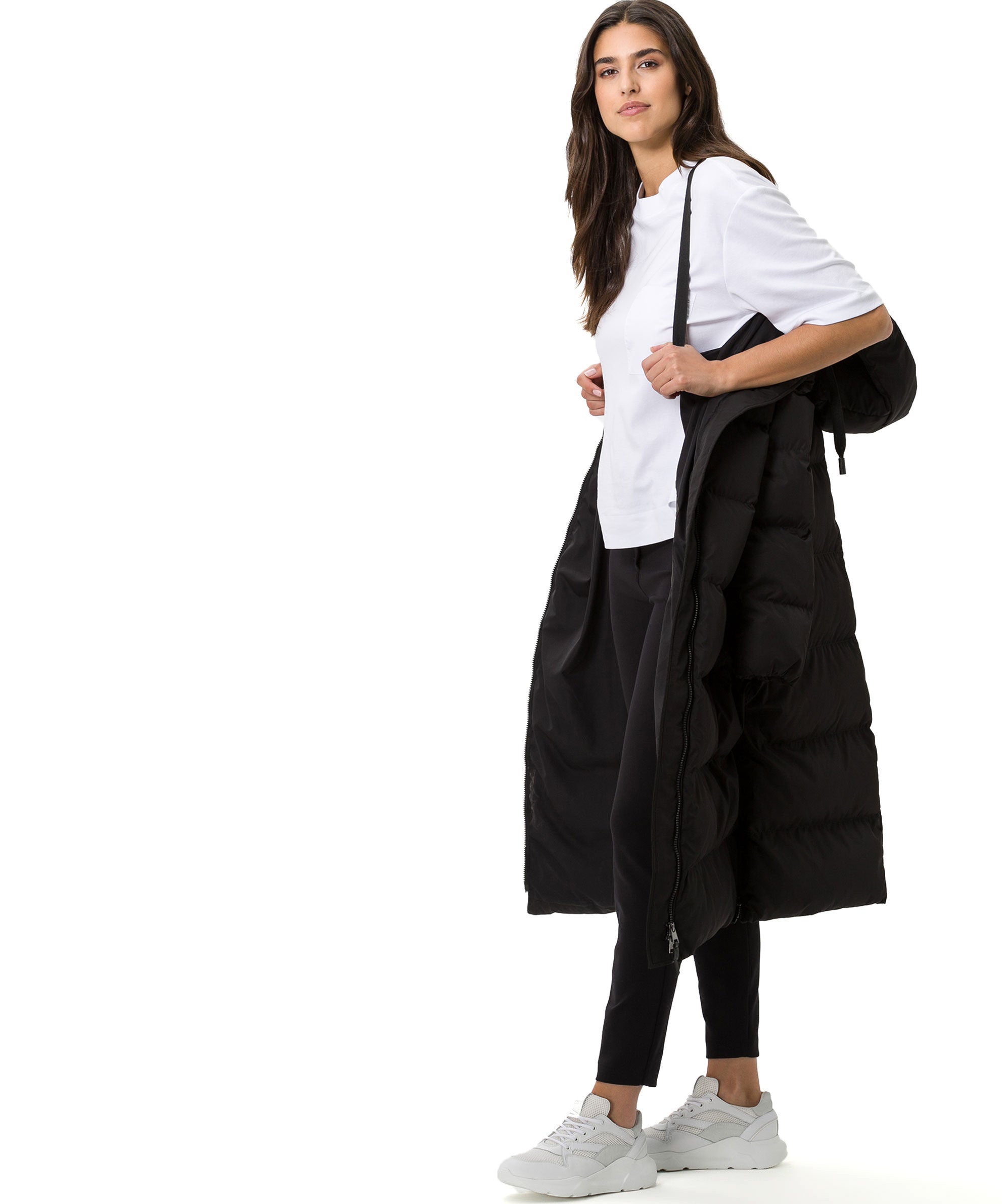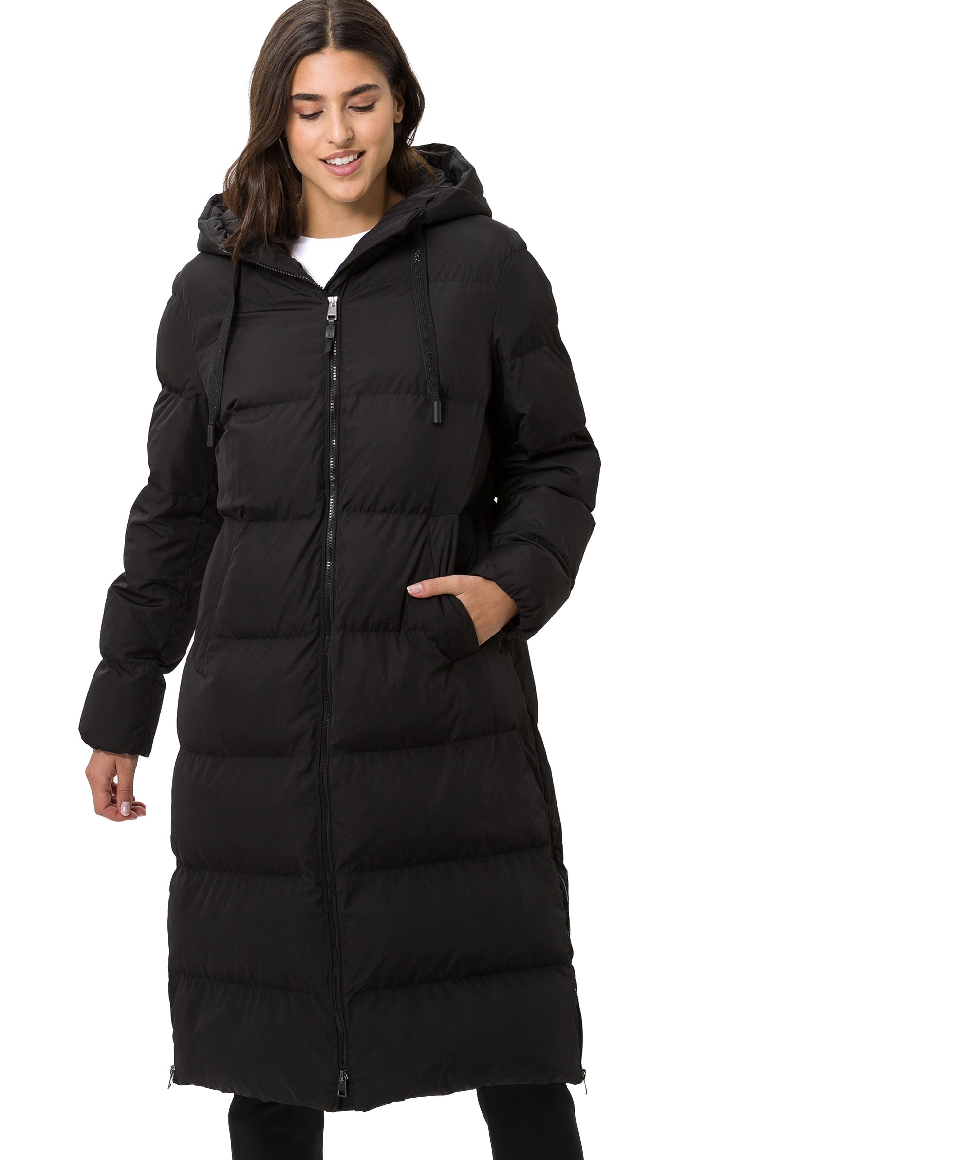 BRAX Zero Down keeps you warm and does not contain any materials derived from animals. A high-quality, synthetic and voluminous filling replaces the typical down feathers in the coat in Style France and, with its pleasant lightness, contributes to a high level of wearing comfort. With this women's coat from the innovative BRAX LAB collection, it's not just the high-quality material that's appealing, but also the contemporary design. The wintry quilted coat for women presents itself in a clean, matt fabric appearance and in a relaxed, longer silhouette. The modern quilted look and the casual side slits with zip complete the look of this trendy coat. Impresses with the attached hood and warmly lined welt pockets. Wear the comfortable alternative to the down coat.