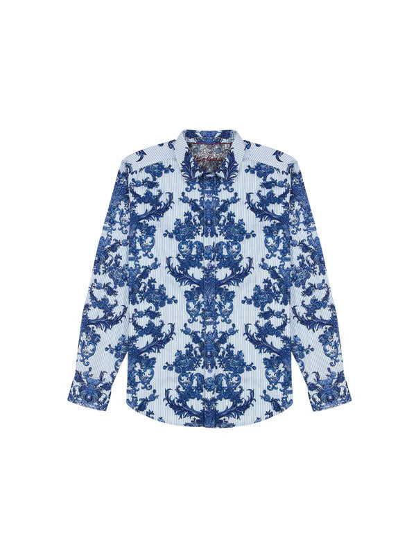 Embrace distinctive style with the Robert Graham Bayswater Woven Shirt. This captivating long-sleeve button-up is a testament to the brand's iconic artistry, featuring an intricate dance of blue baroque florals over subtle light blue stripes. It ’s designed for the man who appreciates luxury and a narrative in his wardrobe.