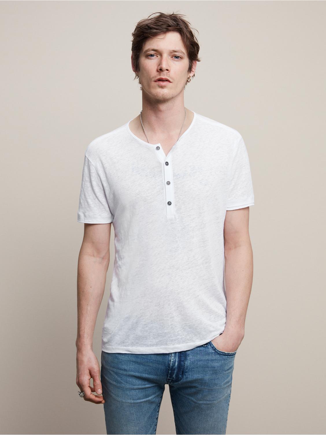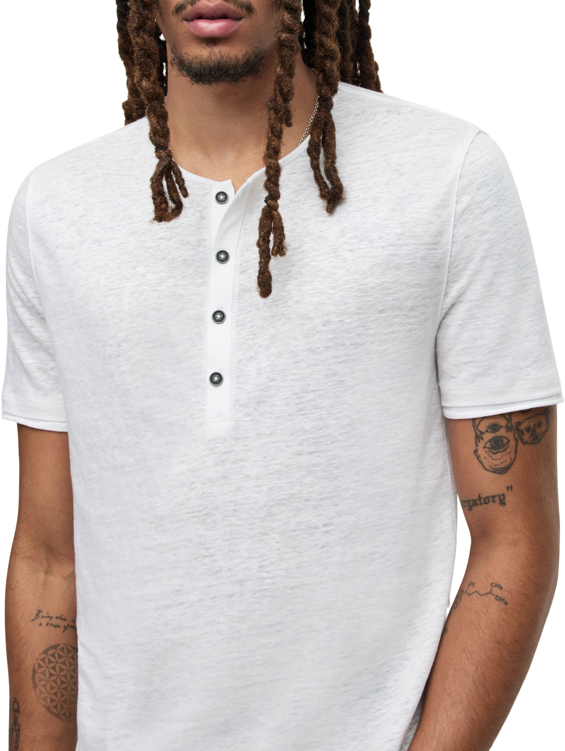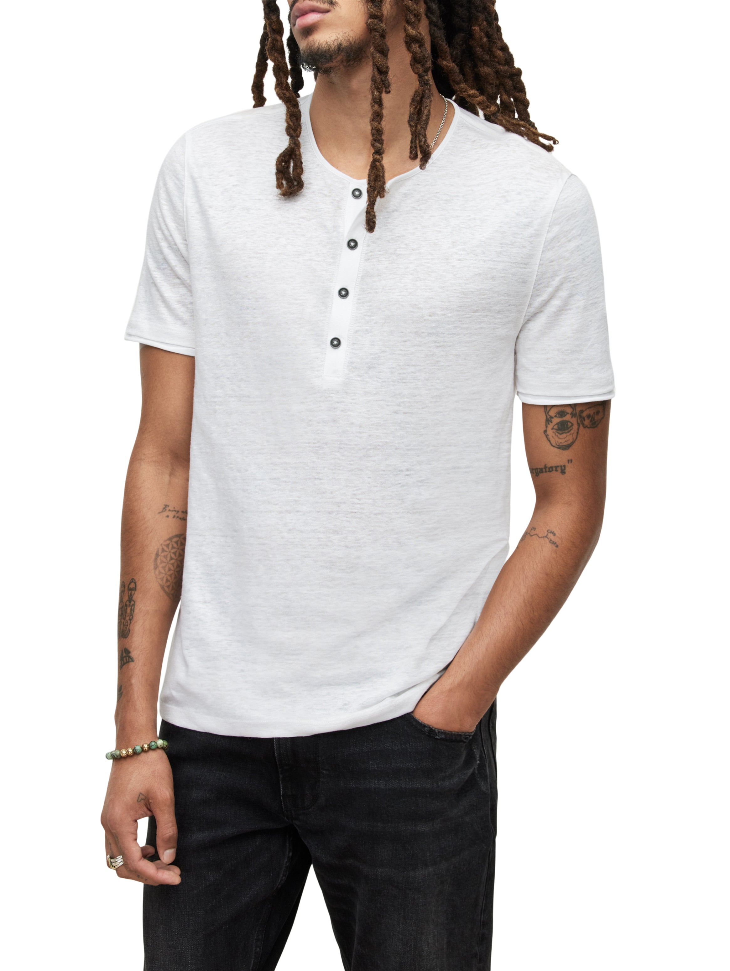 Bolster your basics rotation with this versatile new-season Henley. It's crafted in premium, ultra-soft linen and features cotton jersey trim details and a classic Henley neckline. Wear it solo or layered under jackets.