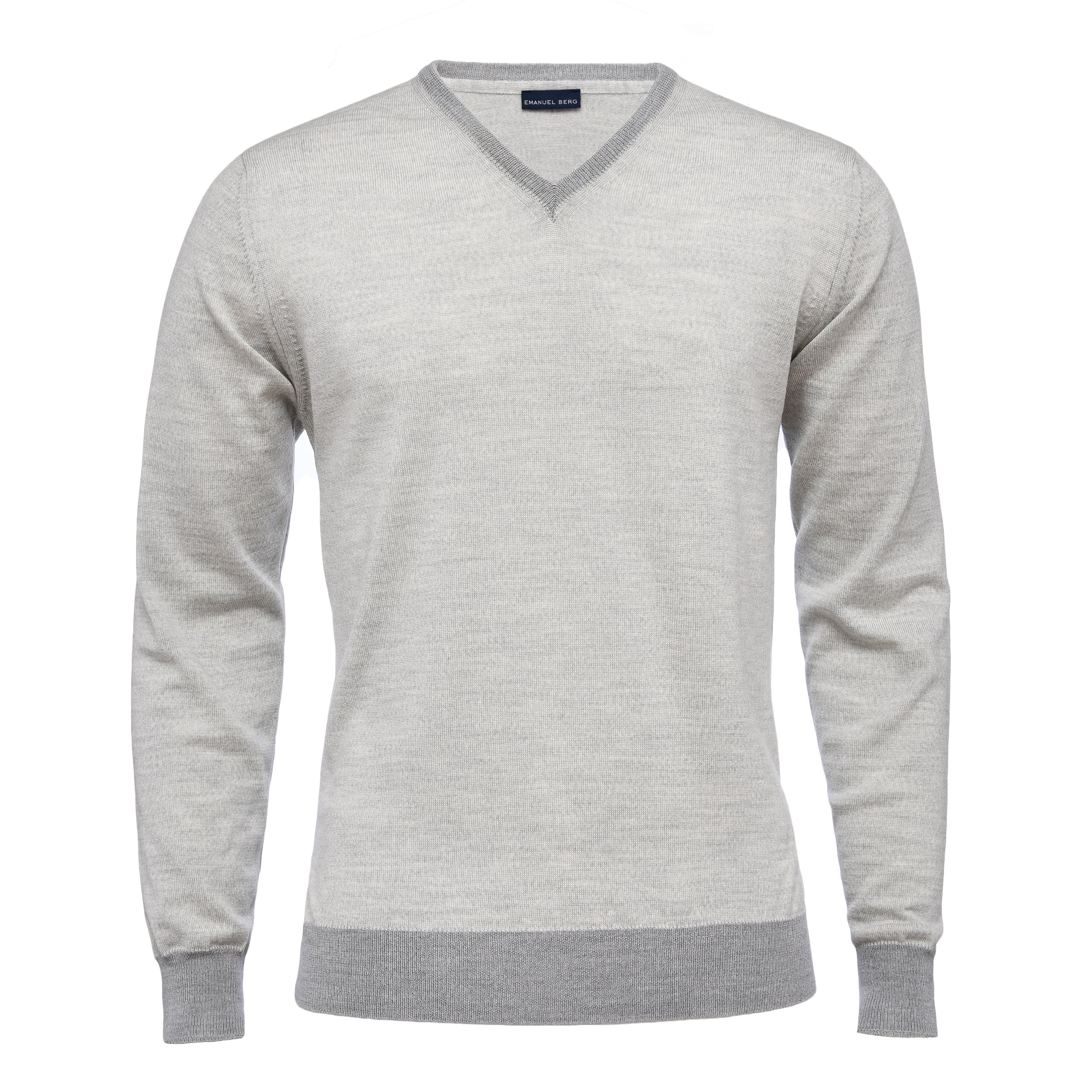 This light grey mélange solid V-neck light gauge sweater comes with contrasted collars, cuffs and waistband.