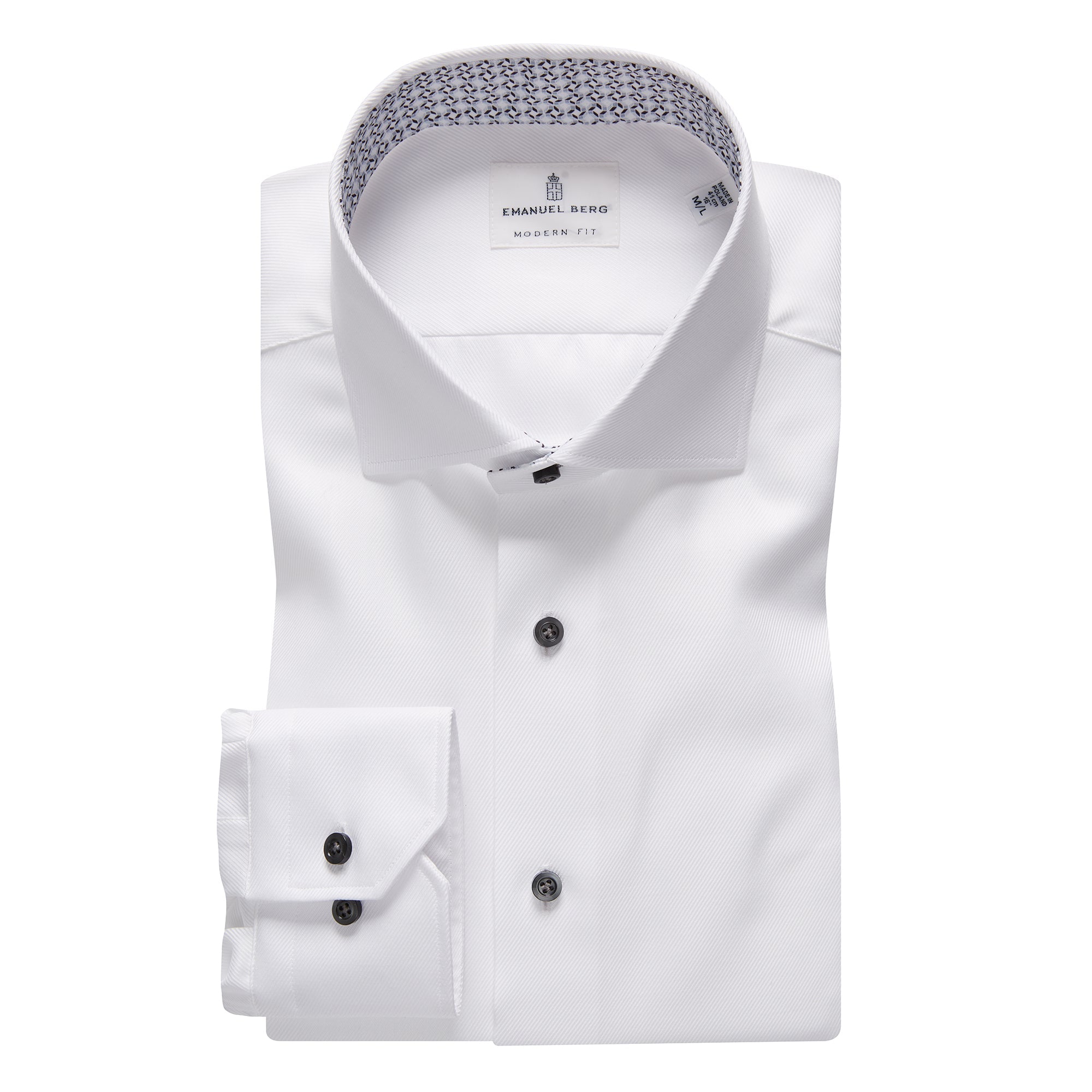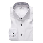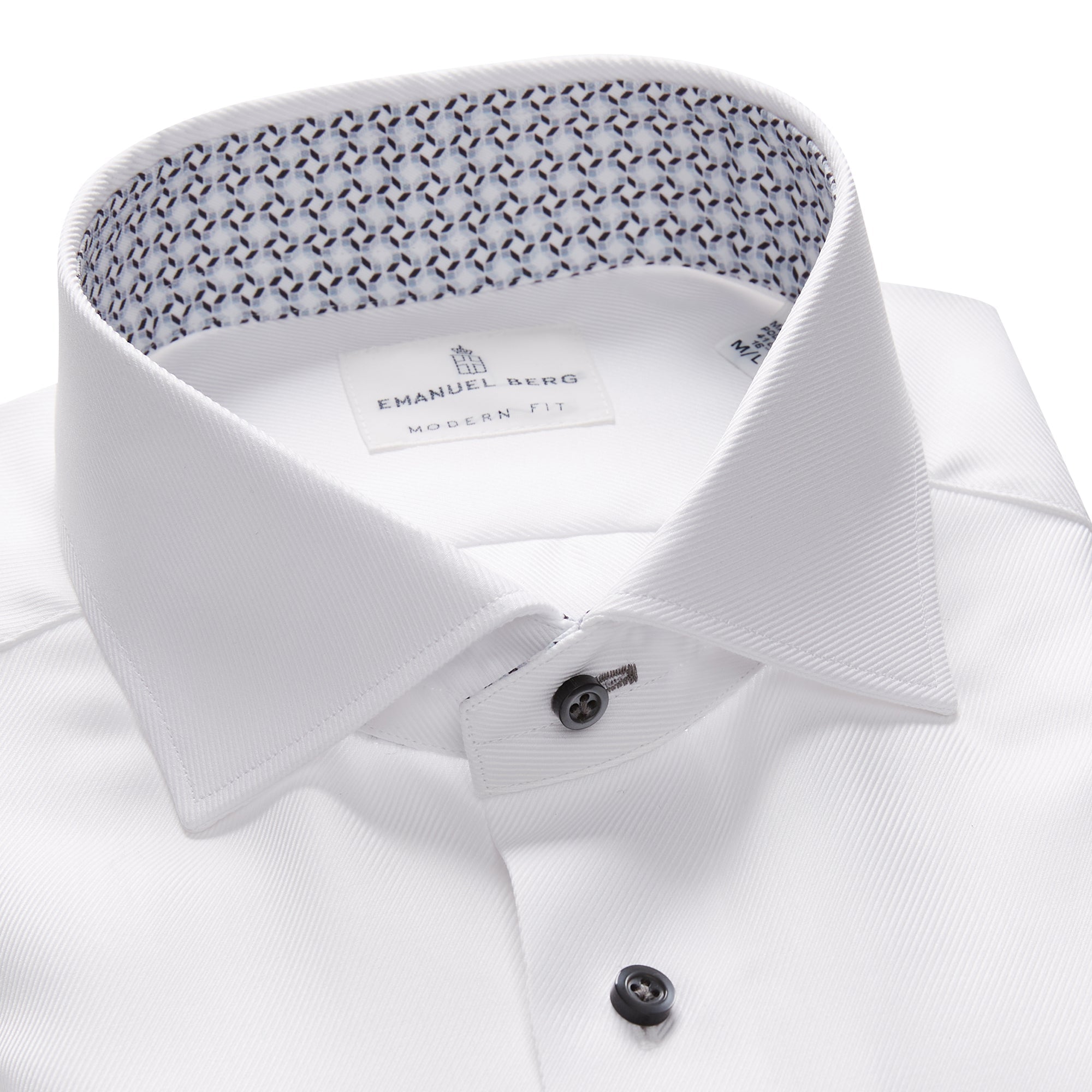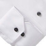 This white textured twill Dress Casual Dress Shirt, comes with our Byron collar, grey buttons, as well as contrast first buttonhole in collar stand with contrast geometric pattern inside collar stand and cuff placket.