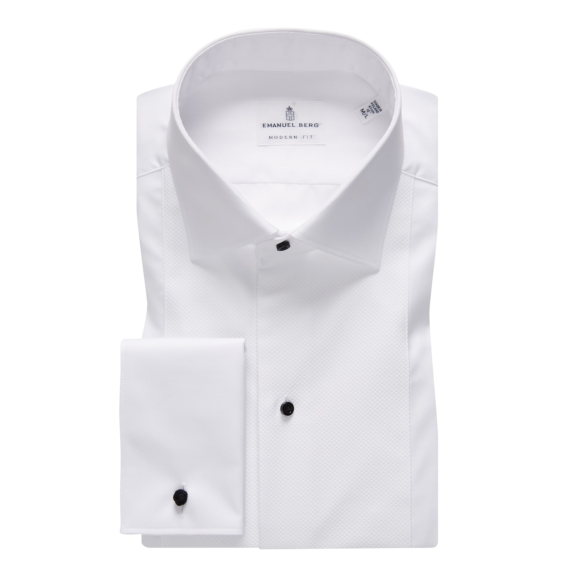 This white textured bib front Formal Dress Shirt, comes with our Mr. Crown collar, French cuff and black removable buttons.