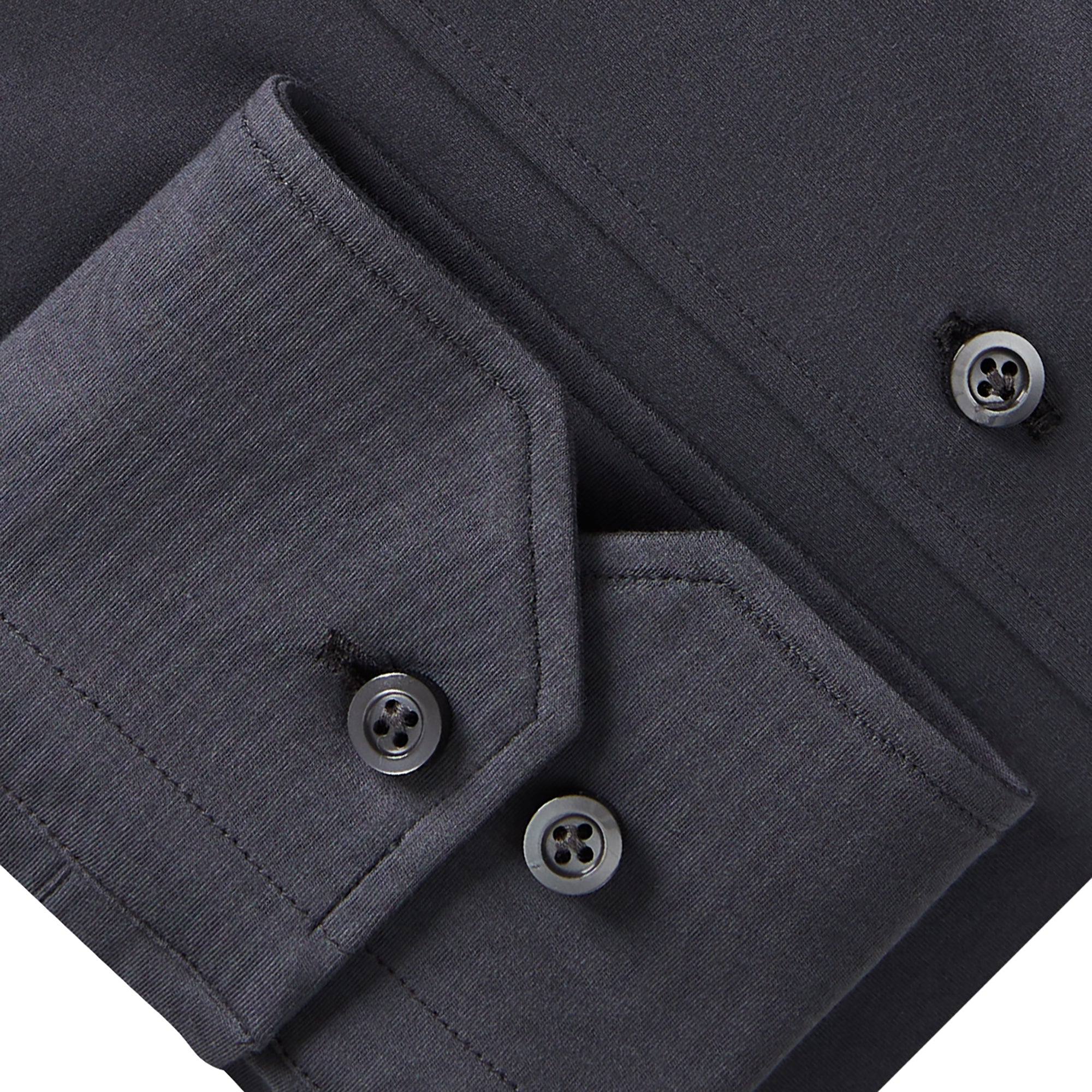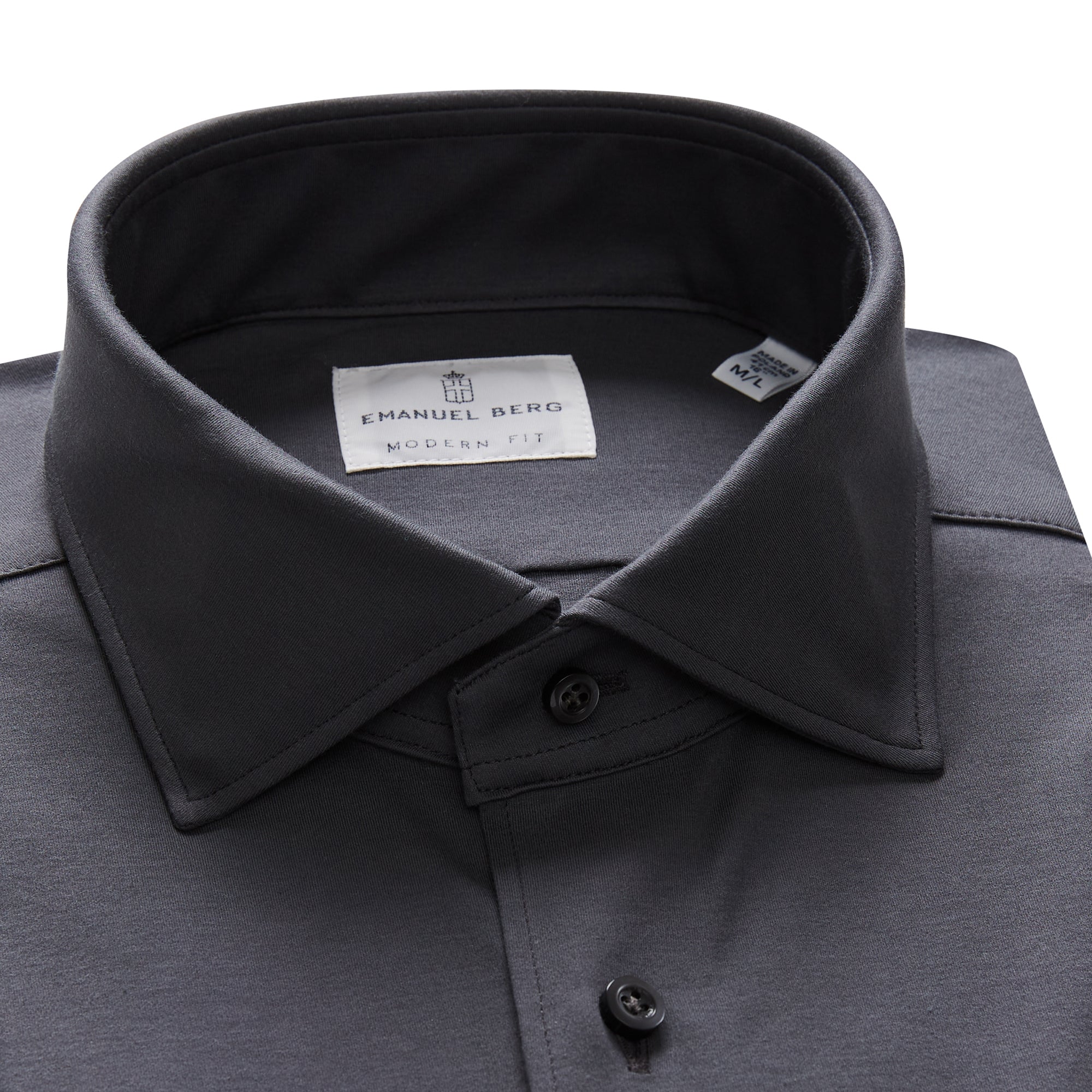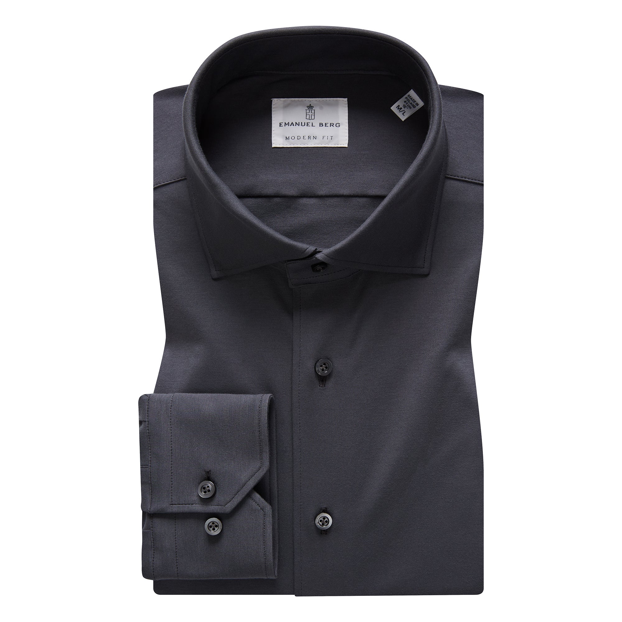 This charcoal solid Modern 4Flex stretch knit shirt comes with our Byron collar and dark grey buttons.
