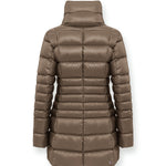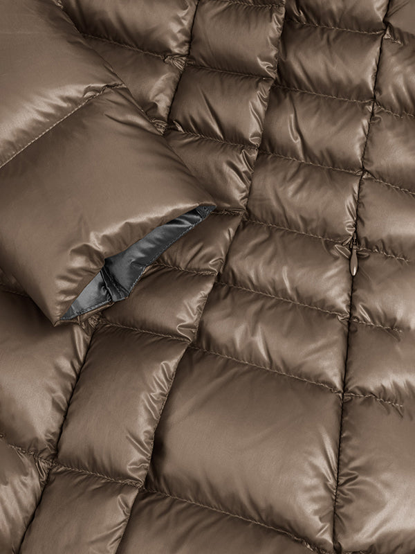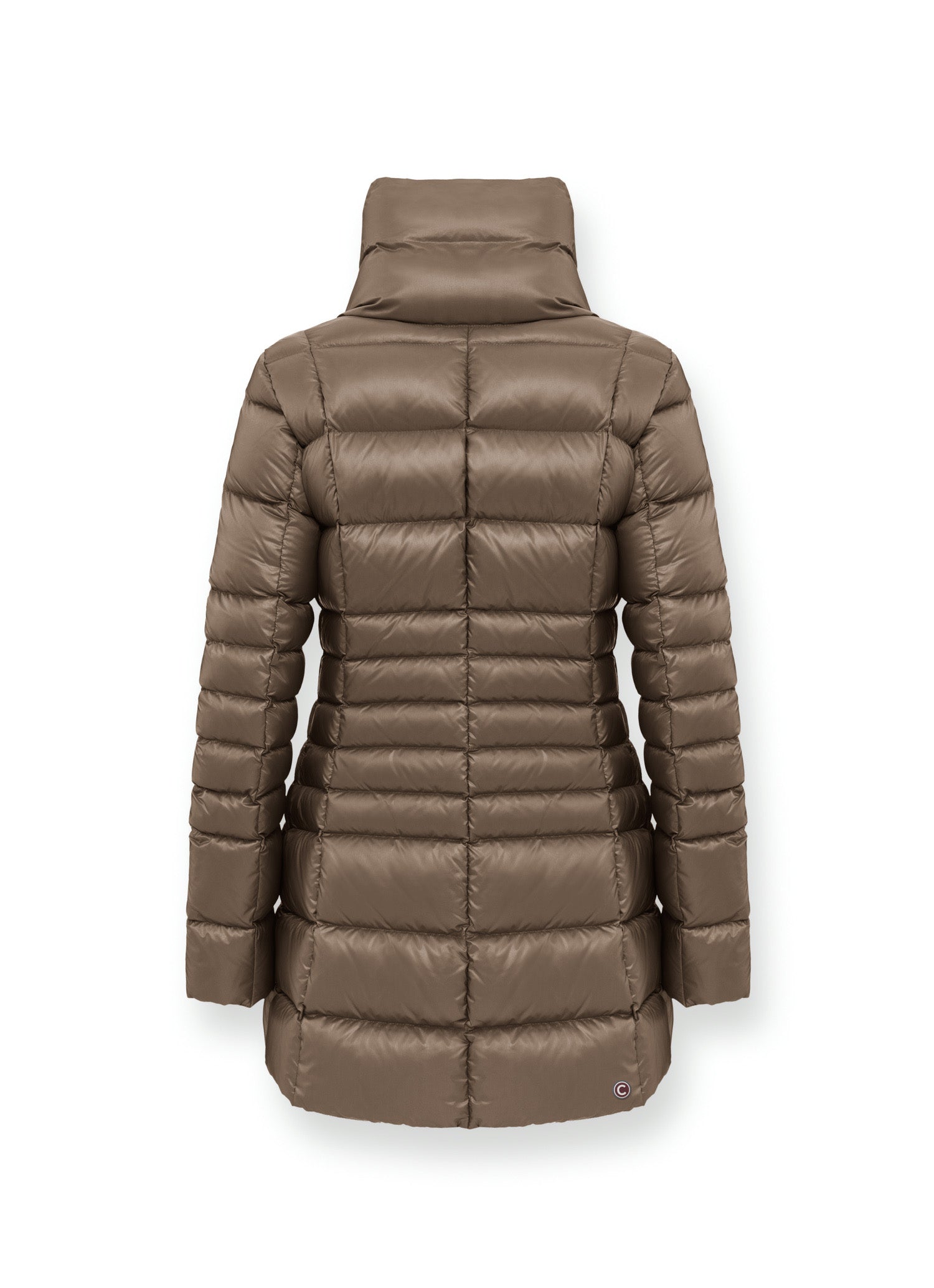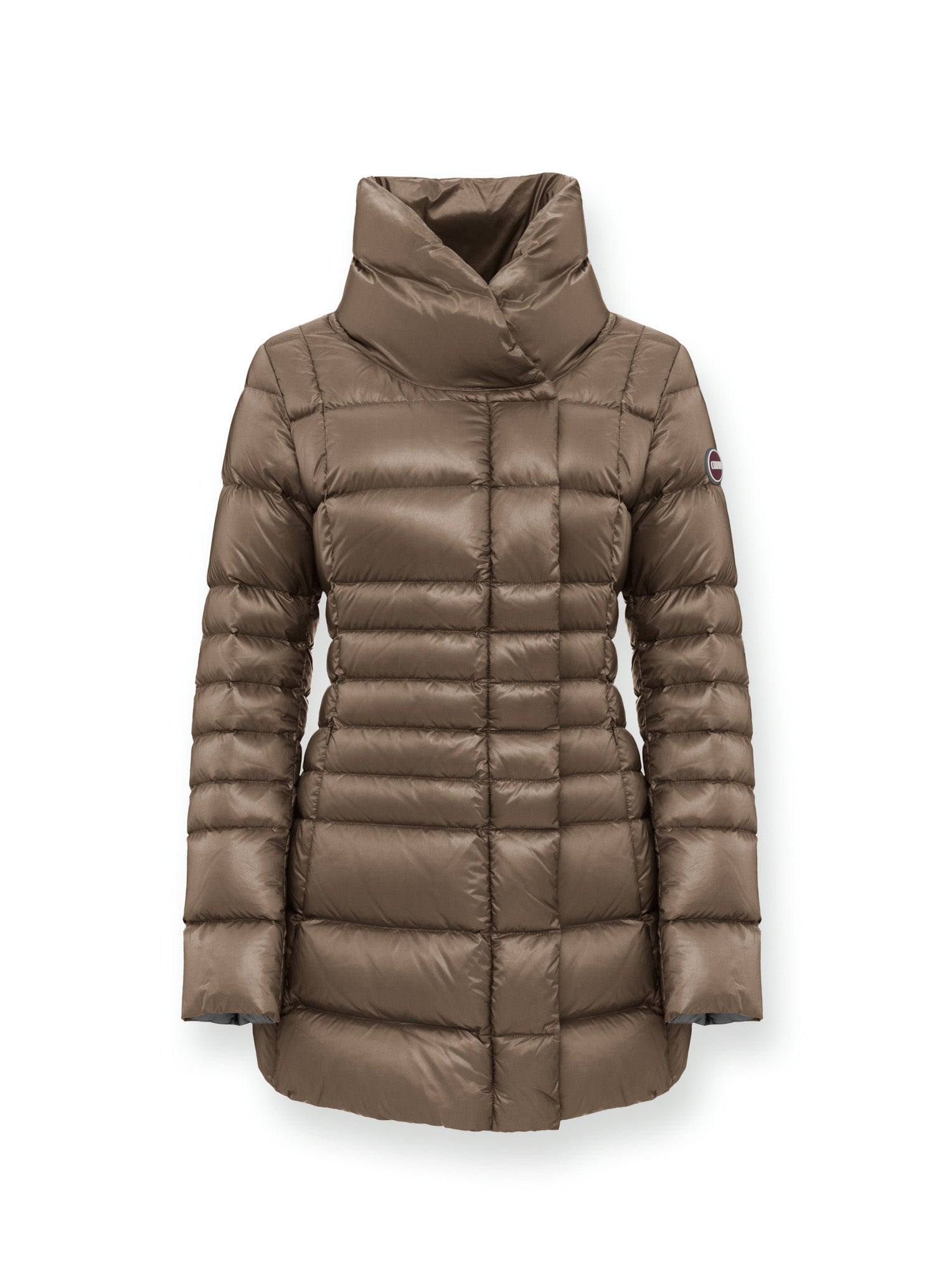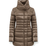 Medium length woman jacket with high and wraparound collar, made by recycled polyamide fabric mixed with a black dyed yarn for dark colors that create a very deep range of colors. Water-repellent treatment. Padded with natural down. The opening side, the enveloping neck and the thicker play of quilts at height waist make this garment very feminine. Comfortable side pockets. Colmar patch on left sleeve and "C" patch on right back, personalize the jacket with company brand logo.