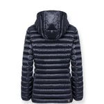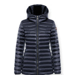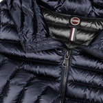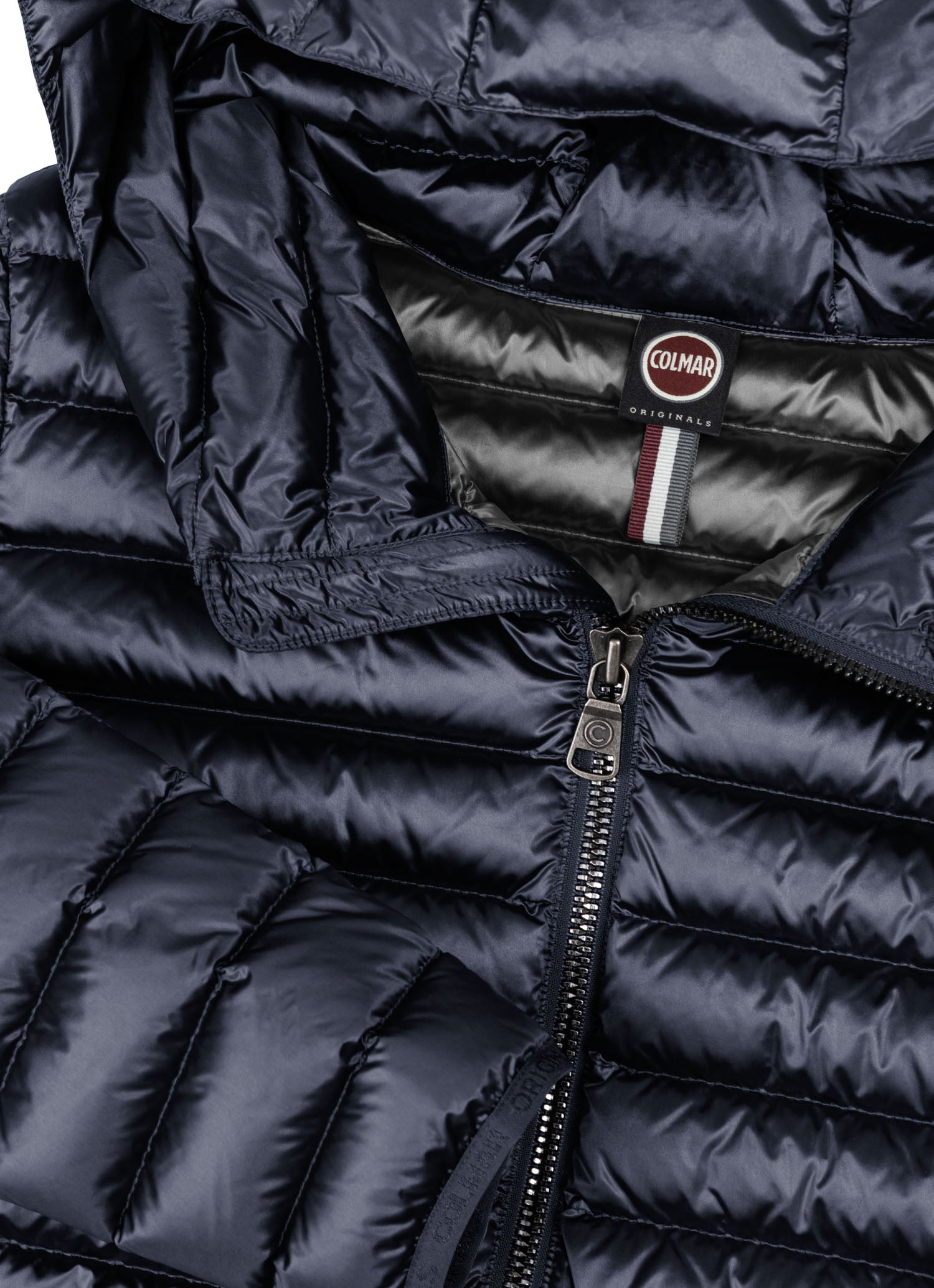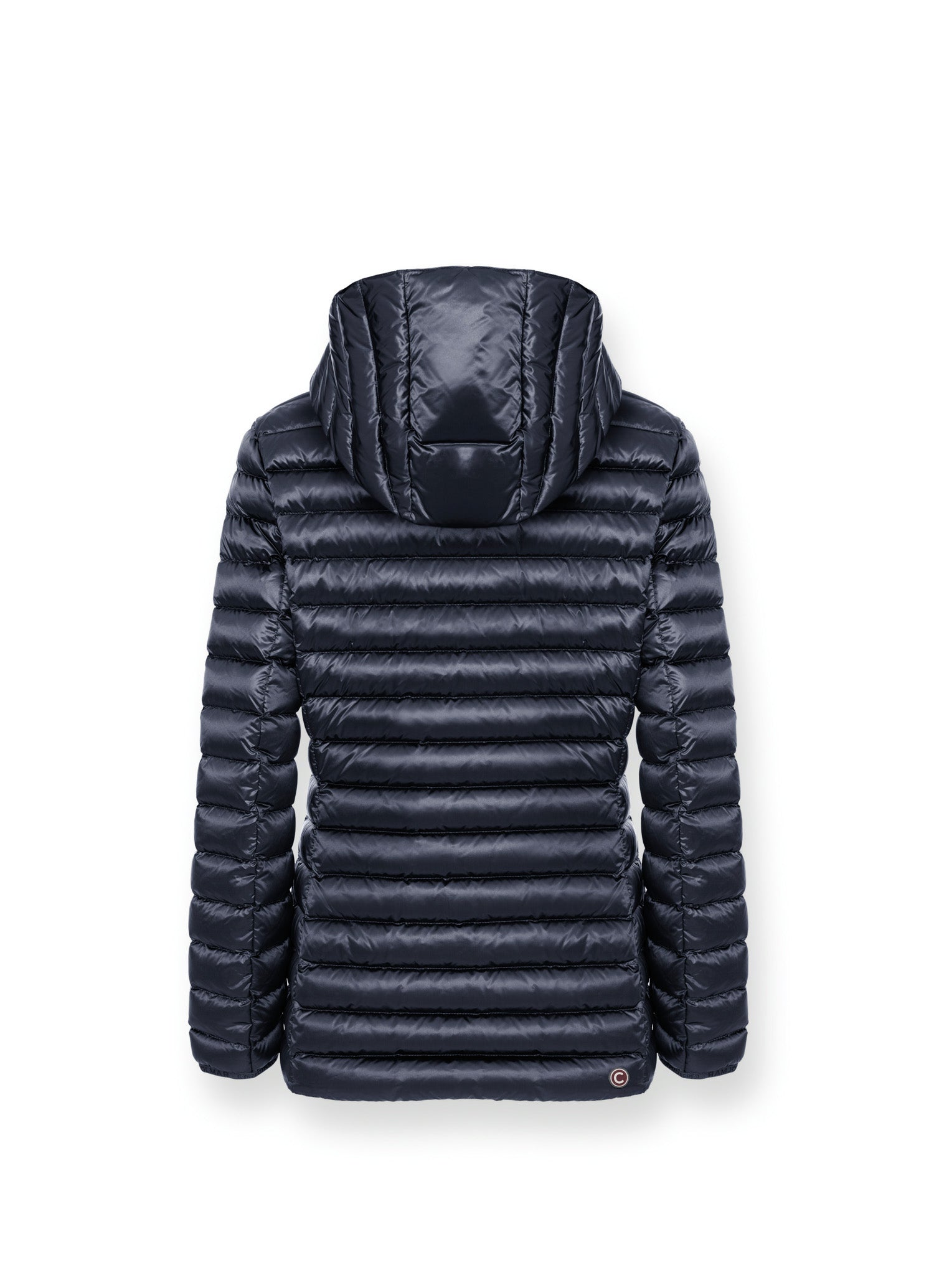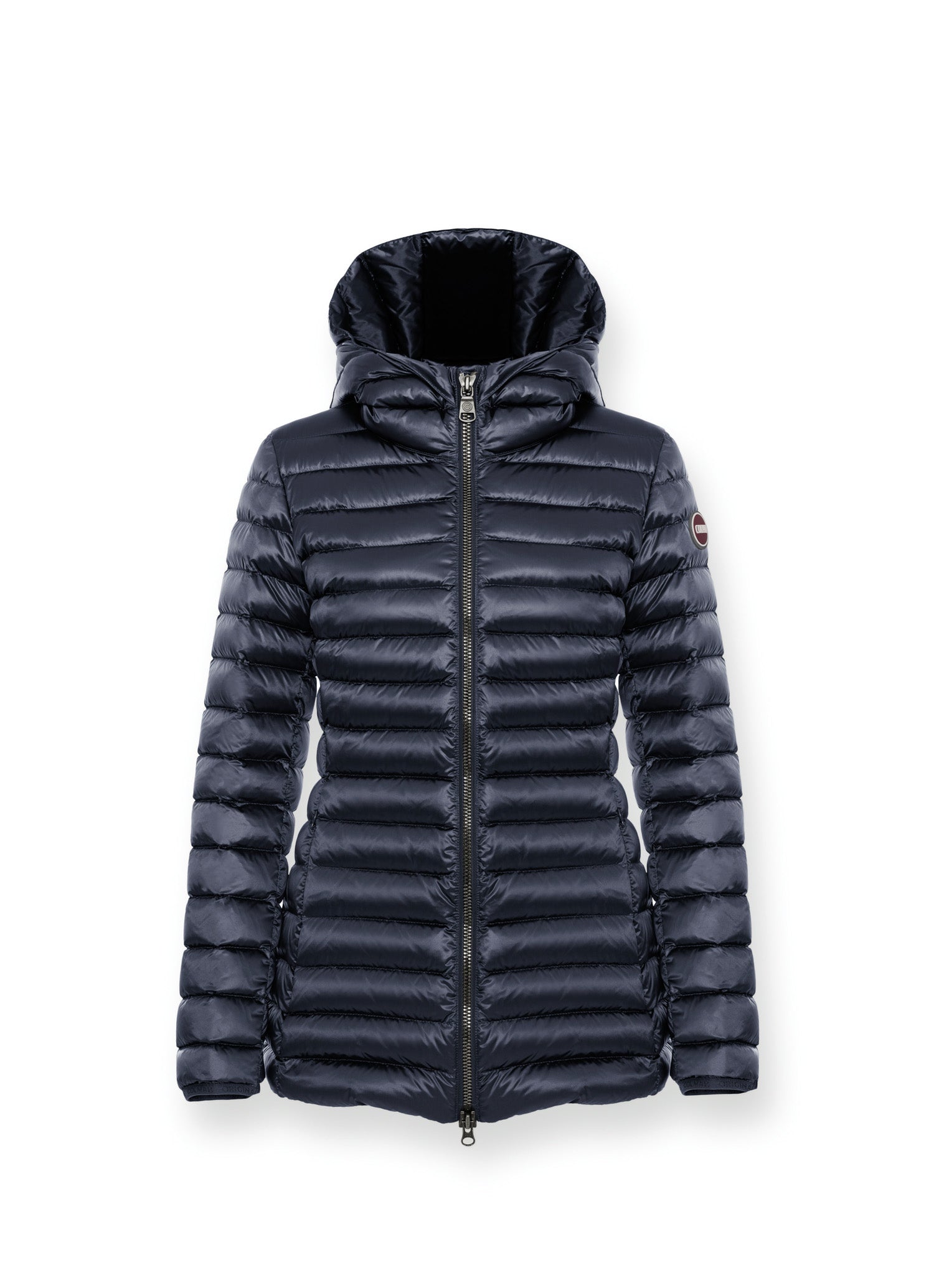 Woman's medium length jacket with undetachable hood made by recycled polyamide fabric mixed with a black dyed yarn for dark colors that create a very deep range of colors. Water-repellent treatment. Padded with natural down. Quilts are regular throughout the body. Cuffs are finished by elastic tape tono on tone. Fit is regular. Comfortable side pockets. Colmar patch on left sleeve and "C" patch on right back, personalize the jacket with company brand logo.