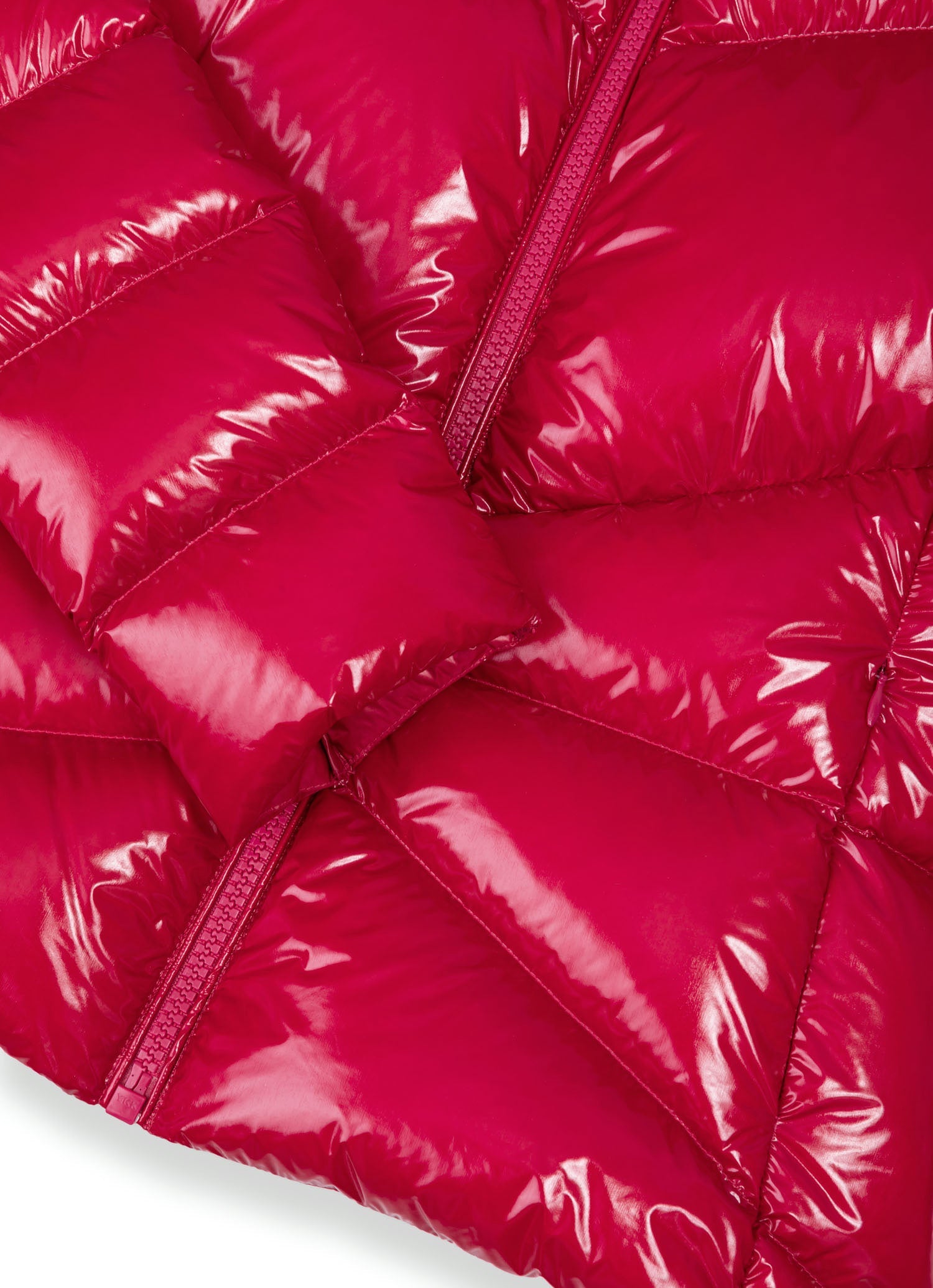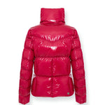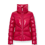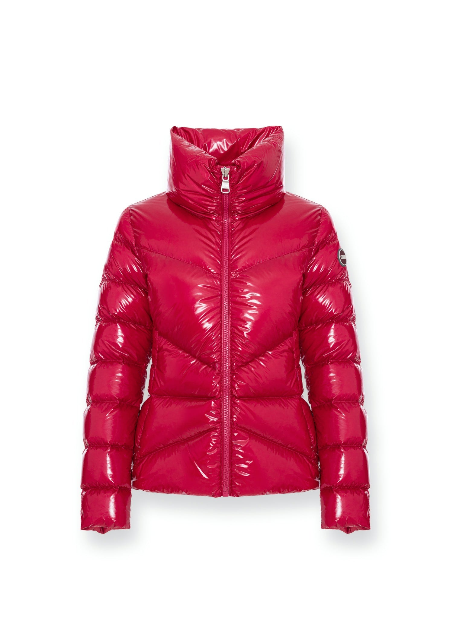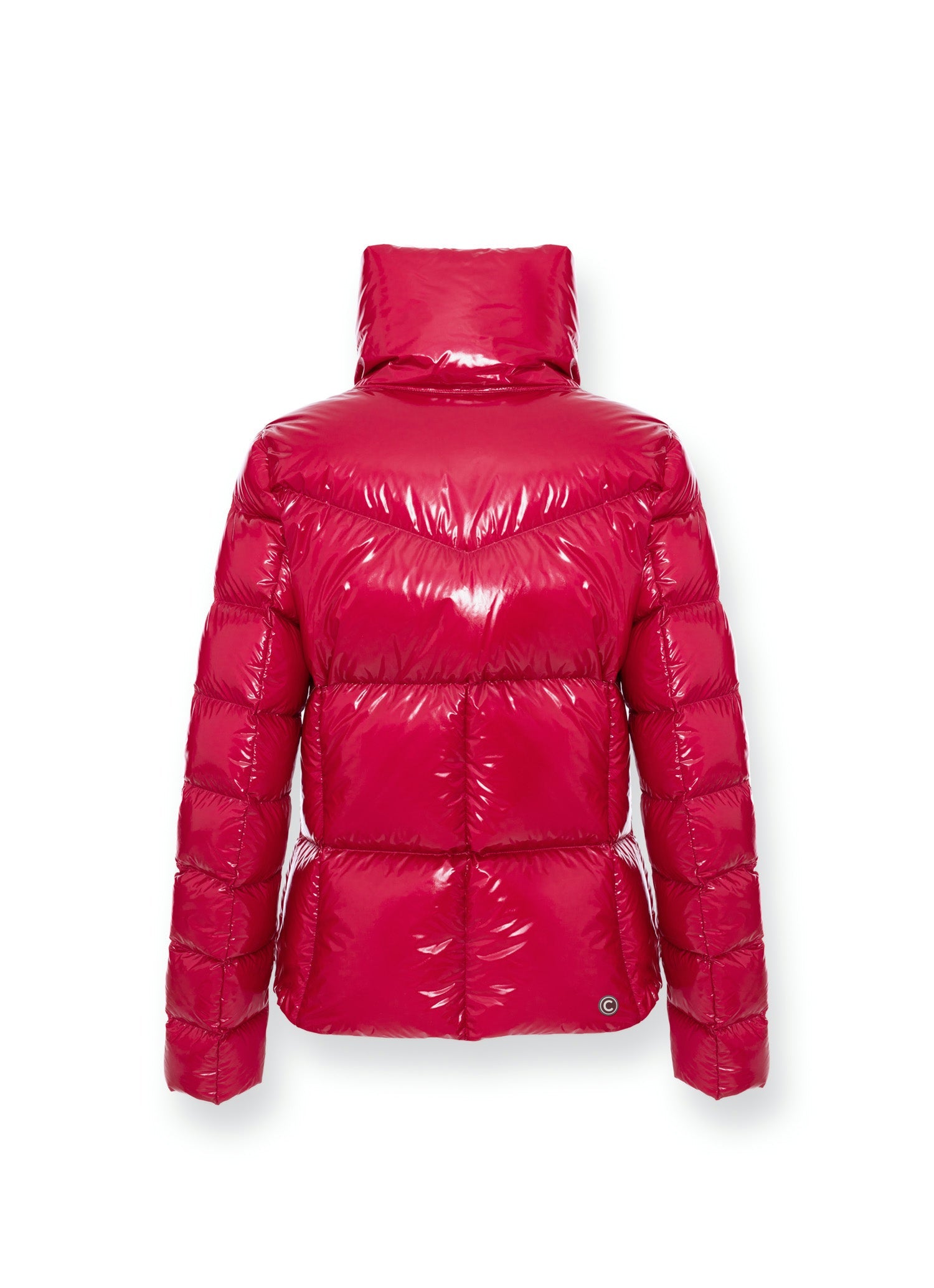 Woman's jacket without hood made by lacquered nylon, super glossy, with brilliant color rendering. Water repellent treatment. Quilts are regular all over the body, with the exception of the upper part of chest where they simulate a "V" pattern. This allows you to have a very sinuous line and a very feminine look. Padded with natural down. Comfortable and practical side pockets. Colmar patch on left sleeve and "C" patch on right back, personalize the jacket with company brand logo.