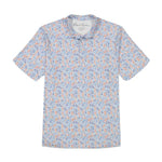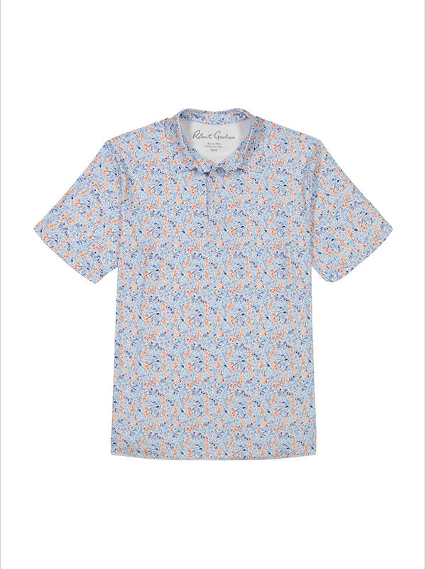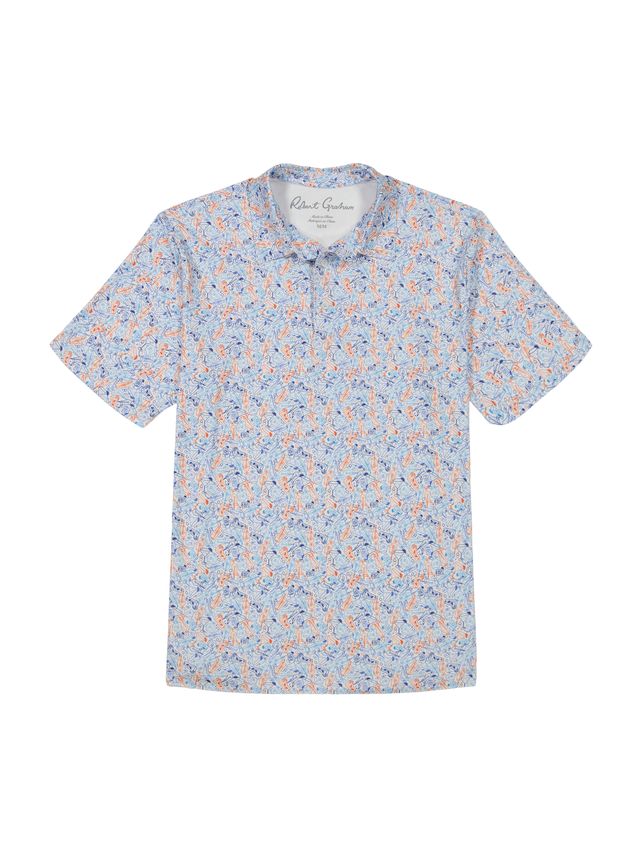 Embrace the vibrant spirit of Robert Graham with the Boozy Bogey Performance Polo Shirt. This distinctive piece showcases an artful all-over abstract print, blending a rich palette of blues and oranges against a light background, exuding a sophisticated yet playful charm perfect for any discerning gentleman.