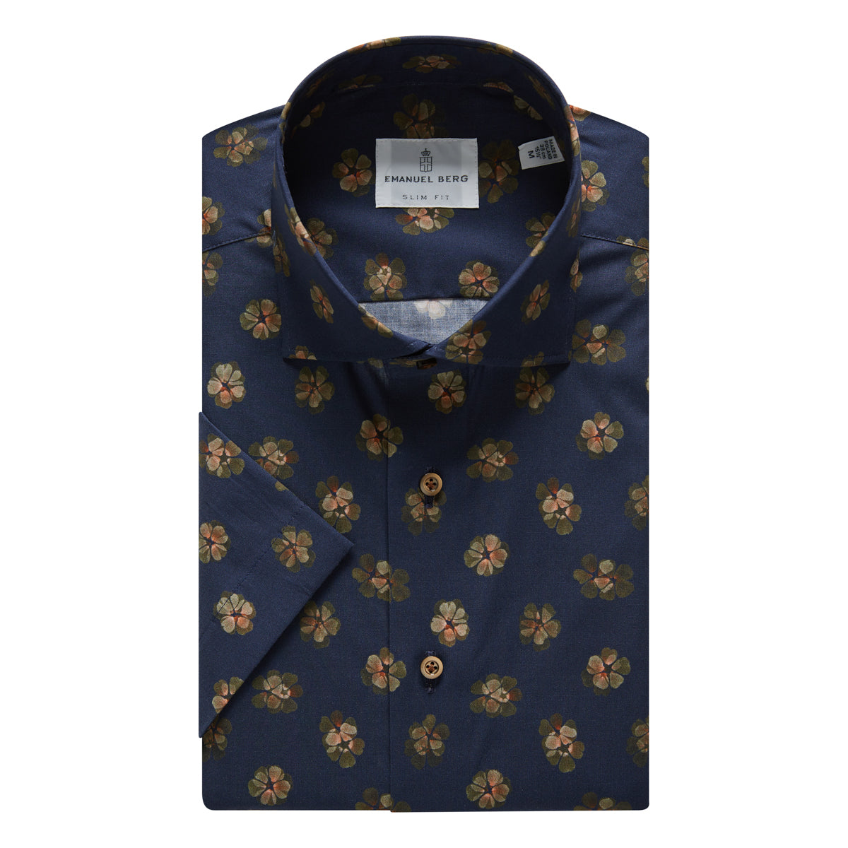 This green and navy clover short sleeve poplin stretch polo comes with our Byron collar and matching carmel buttons.